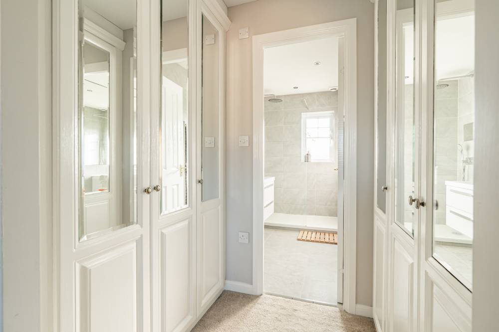 The upper floor consists of a carpeted hallway with timber balustrade and good built-in storage, spacious principal bedroom with dressing room and stylish contemporary en-suite, three further double bedrooms, and main family bathroom with counter sunk basin, bath, WC and separate shower enclosure.