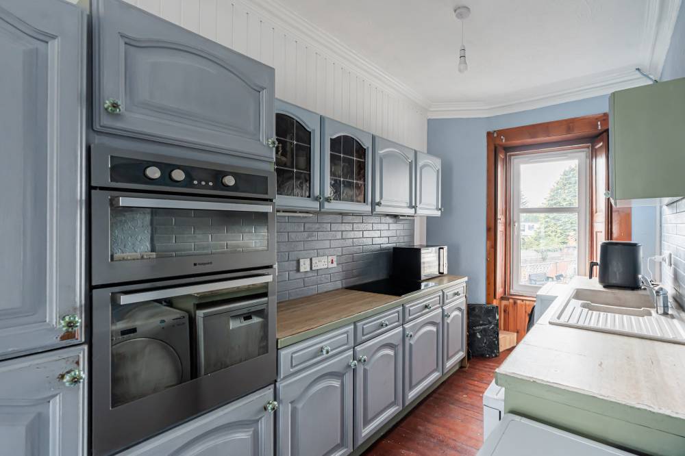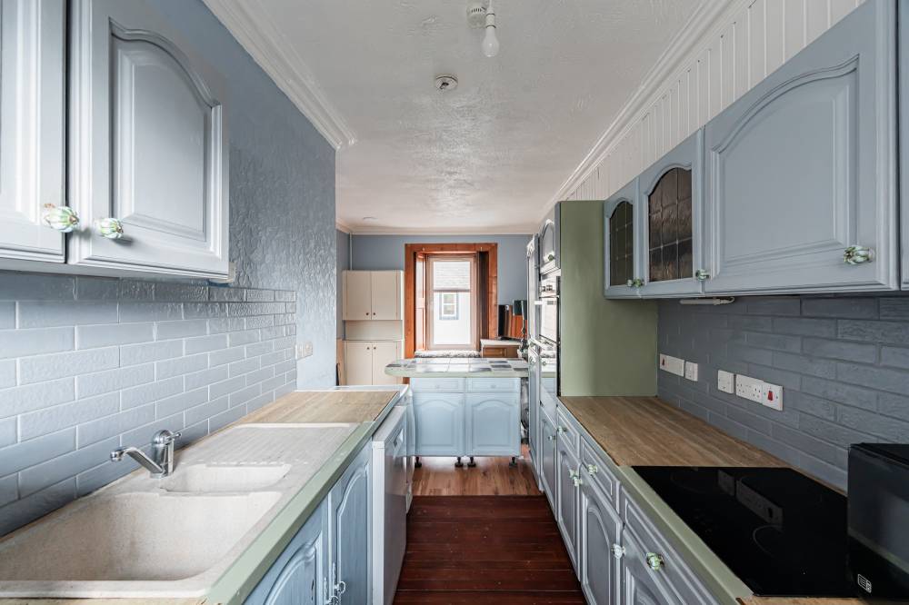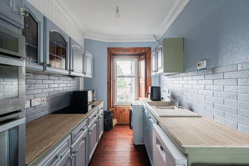 The accommodation is reached via a private entrance and stair, leading to a welcoming hallway which provides access to all rooms. A particularly spacious reception room with dining area forms the heart of the home, set to the front of the property and offering ample space for both living and dining furnishings. Adjoining this is a well laid-out kitchen with a range of wall and base units, providing good storage and worktop space. The property boasts three well-proportioned bedrooms. The principal bedroom is generous in size and is positioned quietly to the rear, while the two further bedrooms provide flexibility for use as additional bedrooms, a study, or home office. A bathroom with three-piece suite completes the accommodation.
