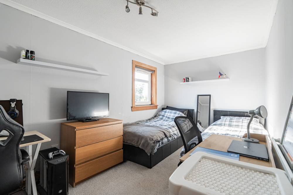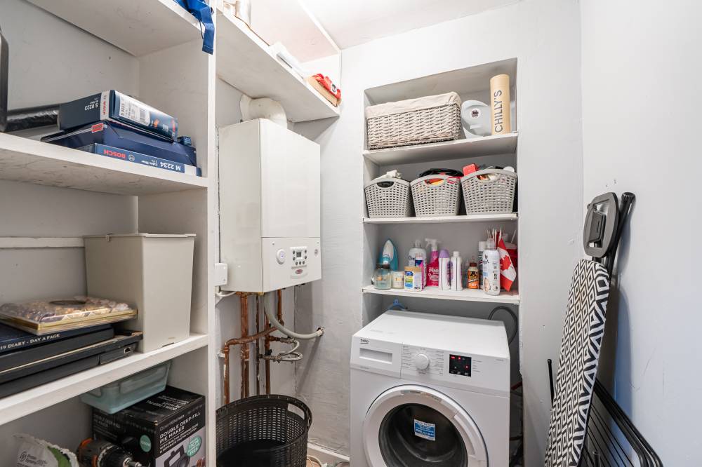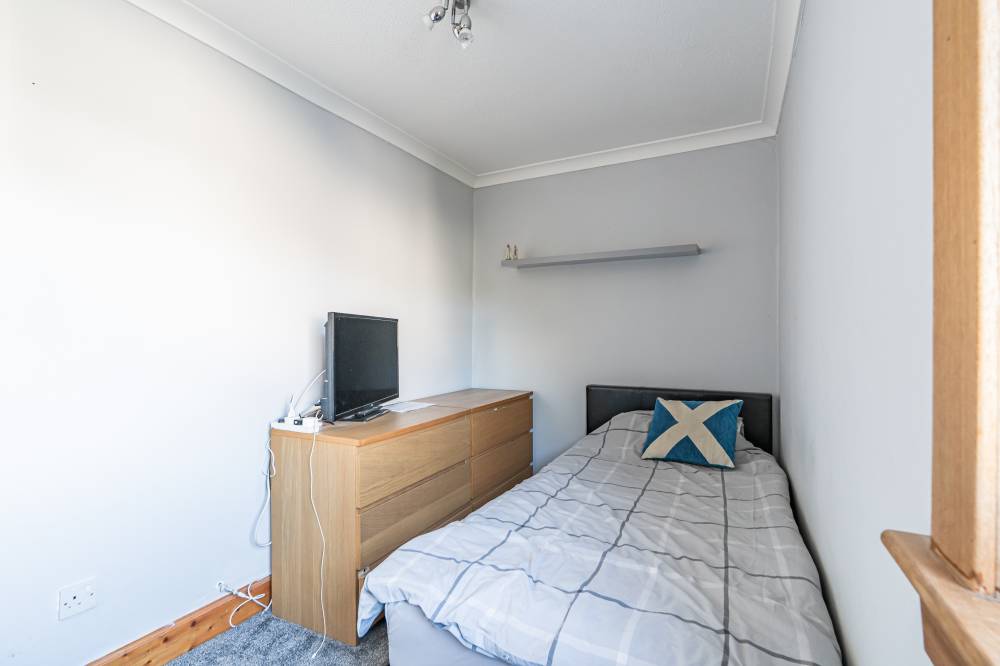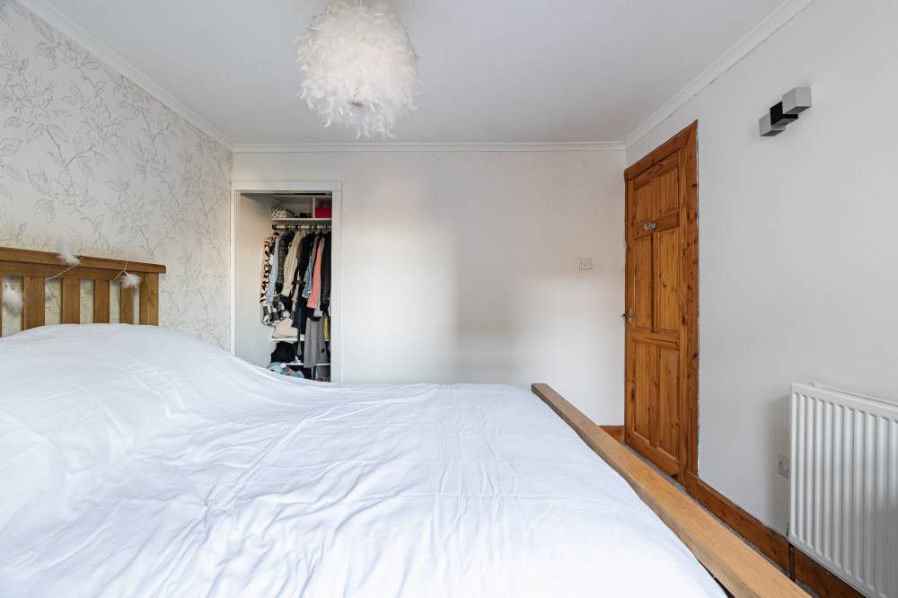 Upstairs, the spacious principal bedroom benefits from built-in wardrobes and fitted carpet, while a second double bedroom enjoys a pleasant leafy outlook. A further large single bedroom with an open aspect provides additional flexibility, whether as a child’s room, home office, or guest accommodation. The modern bathroom is fitted with a contemporary white two-piece suite, a walk-in cubicle with thermostatic shower, chrome heated towel rail, and full acrylic wet wall panelling.
