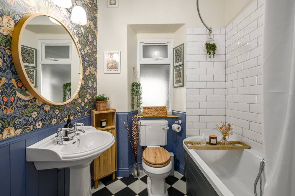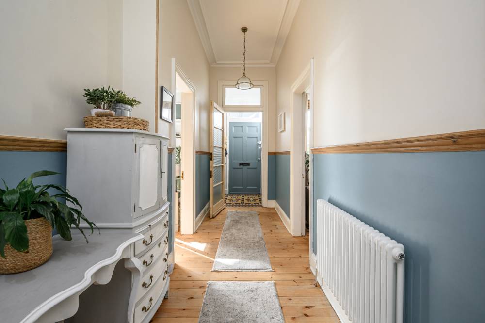 The accommodation continues with a generously proportioned principal bedroom with fireplace and coving, two further bedrooms, and family bathroom which comprises a high-quality Victorian style three-piece suite, monochrome tiled floor and over-bath shower.