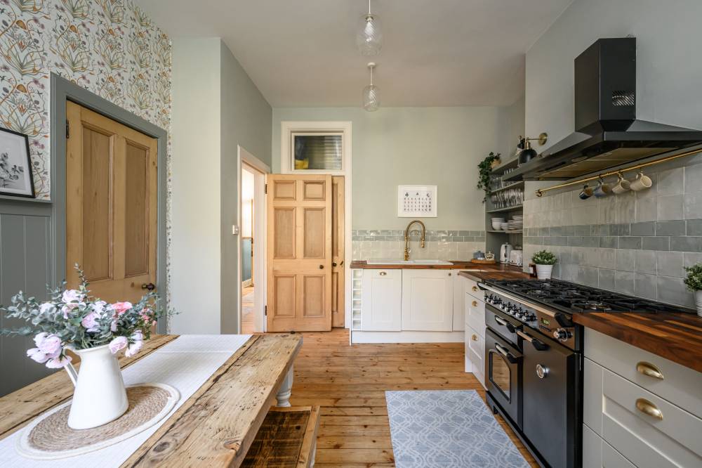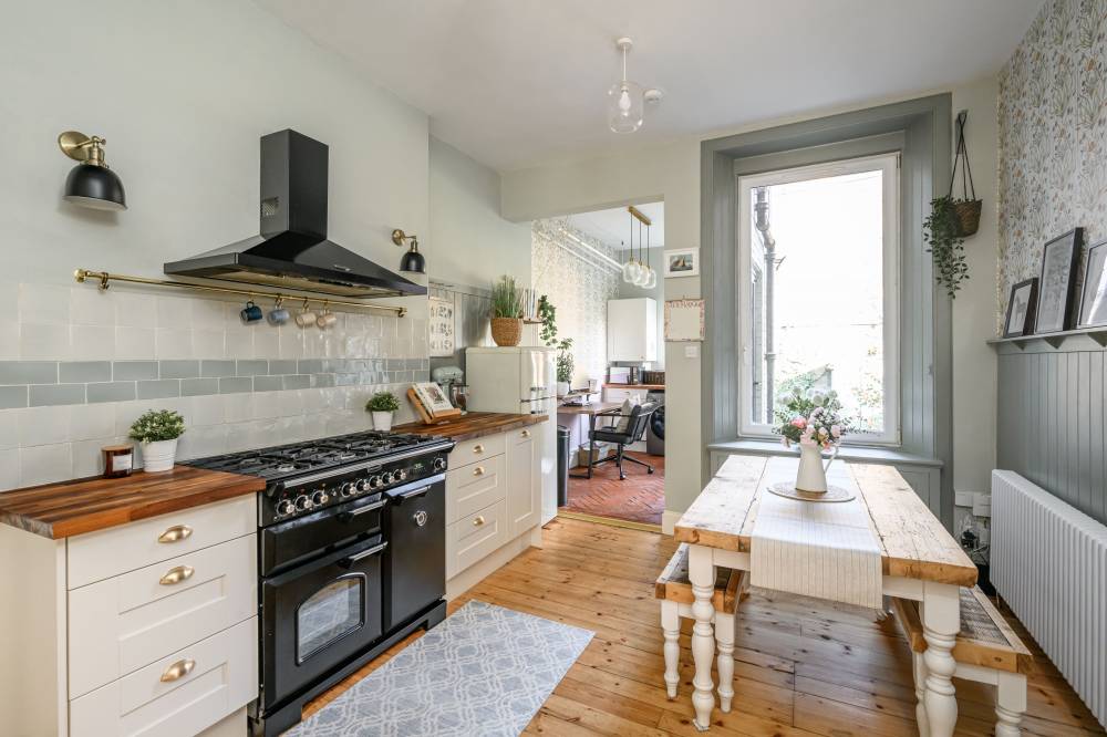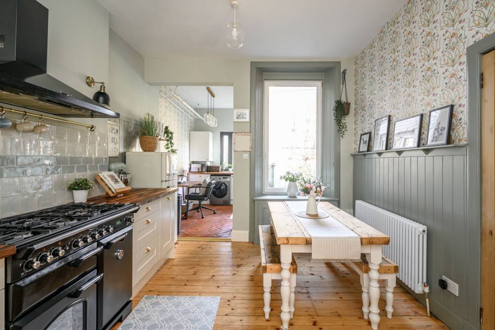 The internal space has a stylish presentation throughout and briefly comprises: entrance vestibule with decorative tiled floor leading into the main hallway which features coving to ceiling and solid wood flooring, bright and comfortable bay fronted reception with tasteful contemporary décor, ornate cornice work and attractive focal fireplace with stove, spacious dining kitchen which acts as a wonderful hub of the house and has been fitted with an excellent variety of modern units, coordinated wood worktops, tiling to splash areas and good built-in storage, off the kitchen there is a versatile utility/storage space which in turn leads to the back garden.