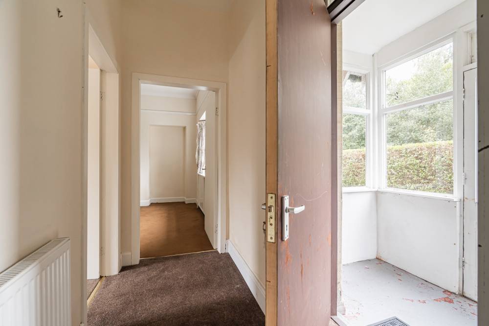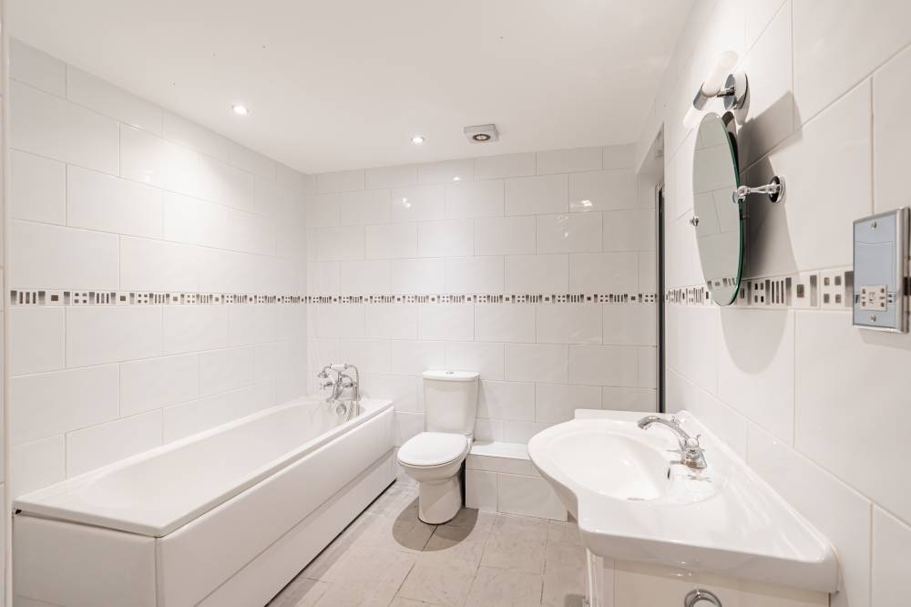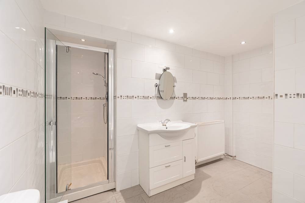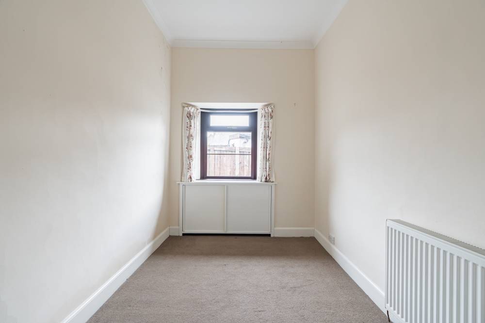 There are two generously proportioned double bedrooms, a front-facing principal bedroom and a rear-facing second bedroom – both benefiting from ample natural light. The bathroom is fully tiled and comprises a three-piece suite, along with a separate cubicle fitted with a thermostatic shower.