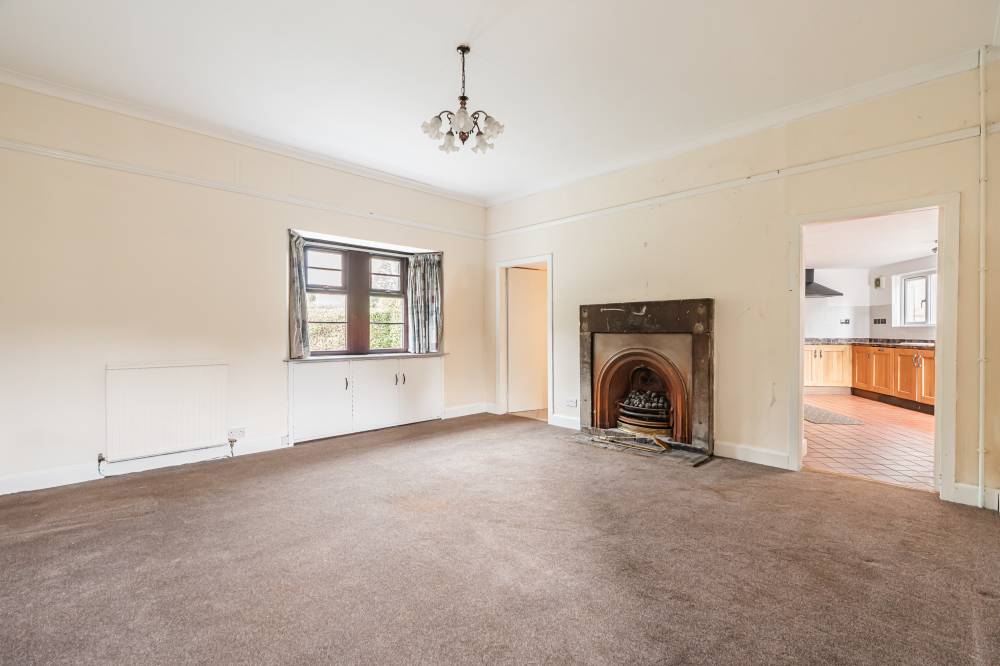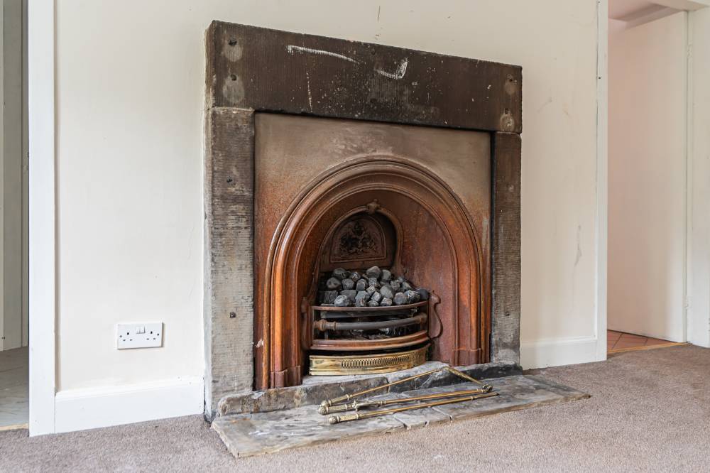 The property comprises a welcoming hallway leading into a spacious reception room, featuring a traditional stone-built local fireplace and dual aspect windows allowing natural light to fill the space.