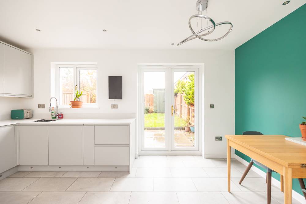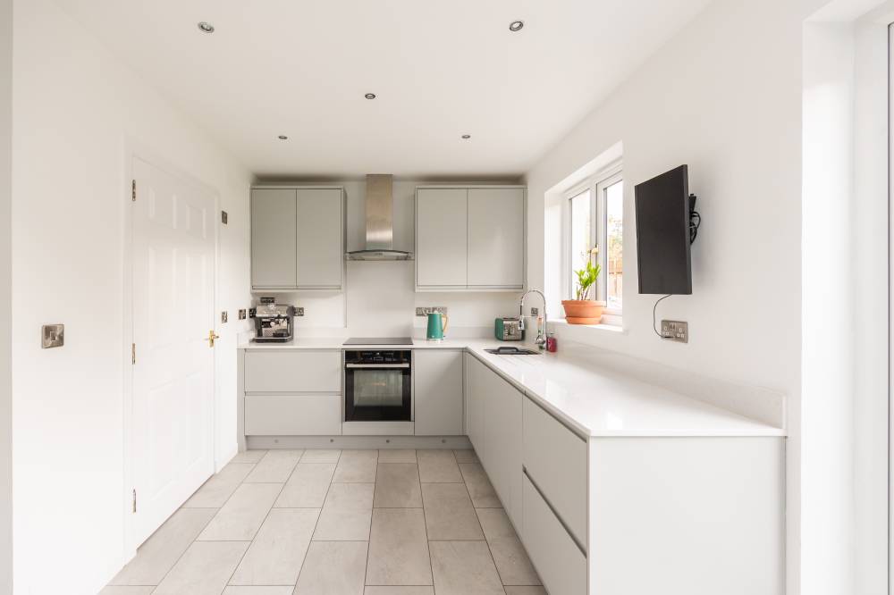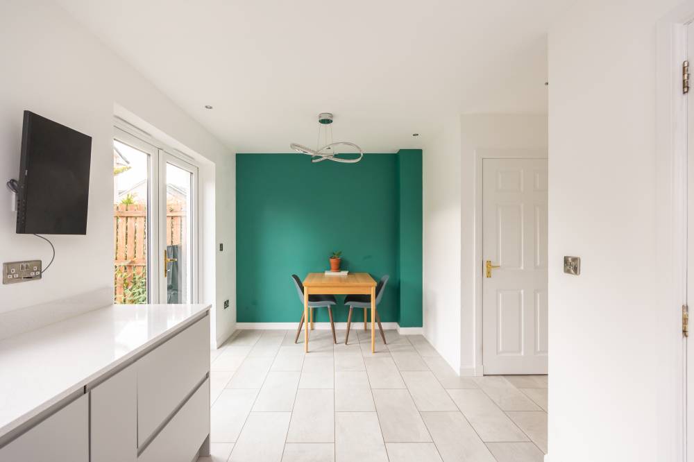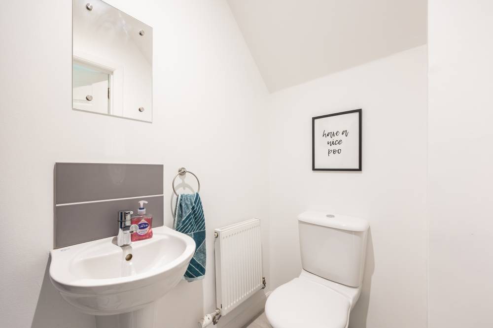 A welcoming hallway sets the tone for the well-maintained interior. The bright and airy lounge flows seamlessly into a stylish kitchen/diner, fitted with a range of integrated white goods, sleek quartz worktops, and under-unit lighting. French doors open directly onto the rear garden, creating a wonderful space for family gatherings and entertaining. A separate utility room provides space for freestanding appliances and additional storage, while a modern two-piece WC completes the ground floor.