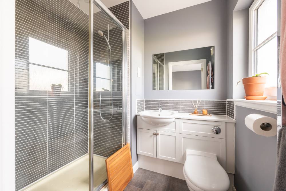 The second floor hosts three further bedrooms – two comfortable doubles (both with built-in wardrobes) and a versatile single room ideal as a home office or study. The main bathroom is finished with partial tiling and includes a shower over the bath. Access to a partially floored attic via a Ramsay ladder provides valuable additional storage space.