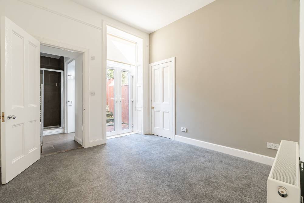 The accommodation briefly comprises: entrance vestibule with ornate stained glass door, extensive entrance hallway with built-in storage cupboard off, light and spacious bay fronted reception room with ornate cornice work, shelved press and attractive focal fireplace, integral kitchen fitted with a variety of base and wall mounted units, with coordinated worktops, tiling to splash areas and an assortment of built-in appliances, rear facing principal bedroom with en-suite shower room and French doors leading out to the rear garden, second well proportioned double bedroom which enjoys a bright south facing aspect, generously sized box room which would lend itself to variety of uses, and bathroom with modern three piece white suite, heated rail and tiling to splash areas.