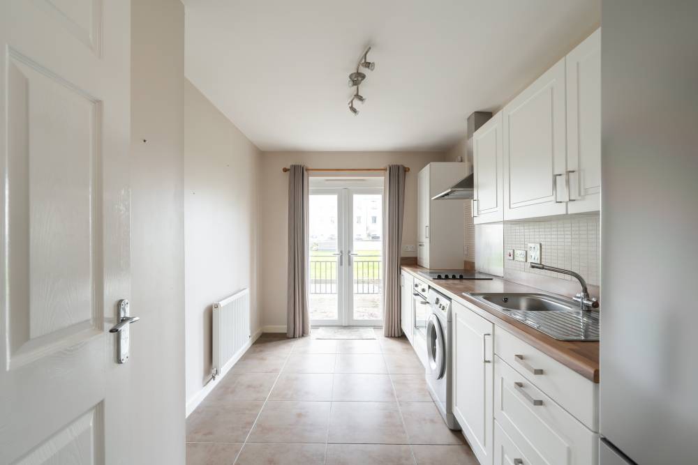 A welcoming entrance hallway provides access to a large and practical storage cupboard. The bright and airy front-facing lounge is a lovely living space, enhanced by two double Juliet-style windows which allow an abundance of natural light to flow through. The immaculate fully fitted kitchen is finished to a good standard and offers a range of integrated and freestanding white goods. Partially tiled splash areas provide easy maintenance, while French doors open directly onto the rear garden, creating an excellent space for indoor-outdoor living. The generously proportioned bedroom enjoys a peaceful rear-facing aspect and benefits from integrated sliding mirrored wardrobes, with ample space remaining for freestanding furniture and flexible layout options. The bathroom is fitted with a modern three-piece suite including a shower over bath, complemented by tiled flooring and partially tiled surrounds.