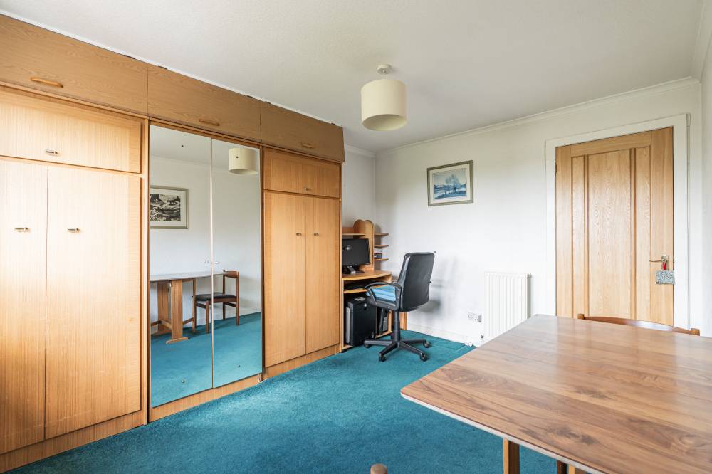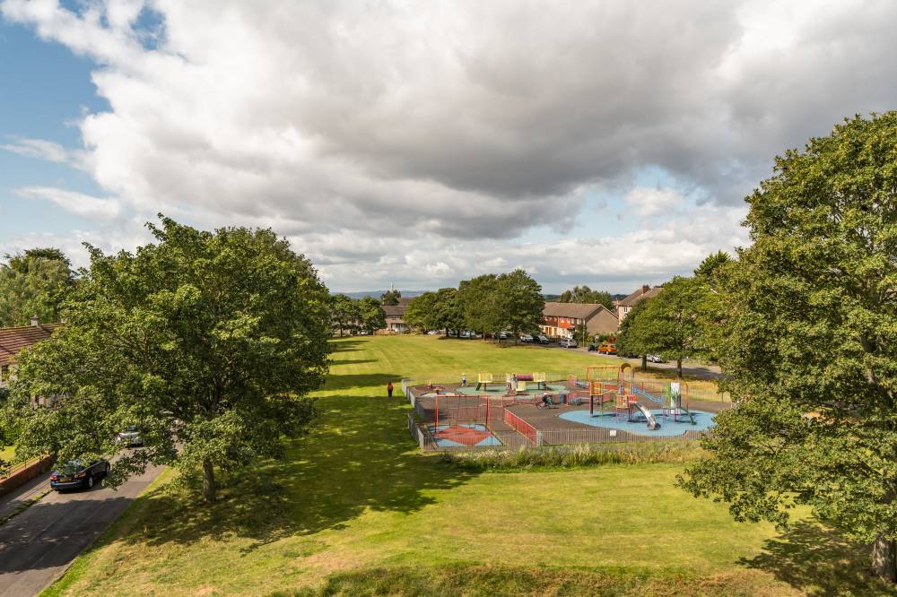 To the rear of the building is a communal garden and drying green, while residents and visitors have access to unrestricted on street parking. To the front of the building there is the size of a football pitch park with fenced children’s play area.