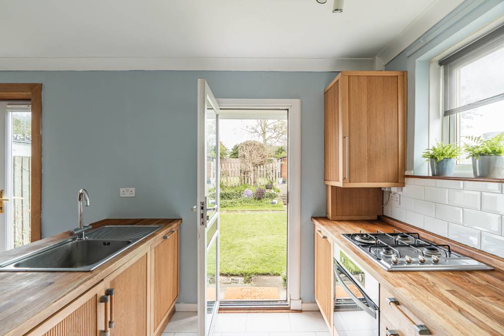Internally, the property is presented in a move-in condition while briefly comprising of; welcoming entrance hallway, bright and airy lounge with a bay window and fitted shelved units, stylish open-plan kitchen/diner with solid oak cabinet fronts and worktops along with a range of integrated white goods, tiling in splash areas, sizeable understairs cupboard and French doors leading to the garden, first floor landing with access via a Ramsay ladder to the partially-floored attic, two generously-proportioned double bedrooms both with ample room for different configurations, third single bedroom with a handy over stairs cupboard, and a sleek fully-tiled bathroom suite with an over-bath shower and heated towel rail.