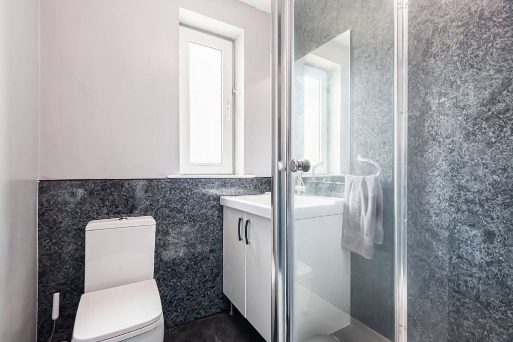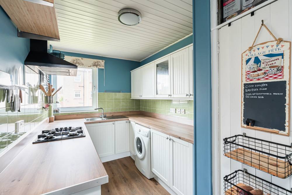 Upon entering through the main door, a private internal staircase leads to a welcoming inner hallway with useful storage. The front-facing reception room is bright and inviting, featuring a focal fireplace and stylish laminate flooring, creating a comfortable space for everyday living. The fitted kitchen is well-equipped with a range of wall and base units, providing ample storage and workspace, while tiled splash areas add practicality. An integrated oven and hob complete the modern setup. The principal bedroom is generously sized and benefits from built-in storage, maximizing functionality. Two additional well-proportioned double bedrooms enjoy a pleasant rear aspect, offering flexible accommodation for a growing family or home office space. The shower room is fitted with a crisp white two-piece suite, complemented by easy-clean acrylic wall panels and a shower cubicle with a Mira electric shower for added convenience.