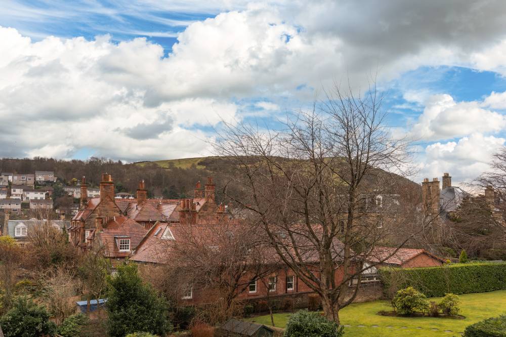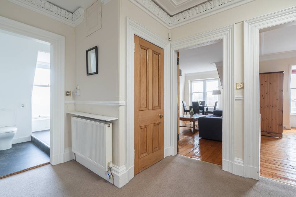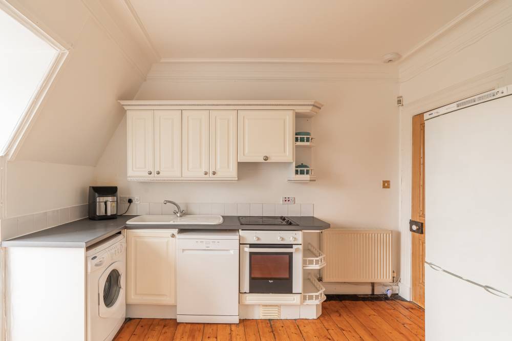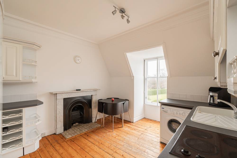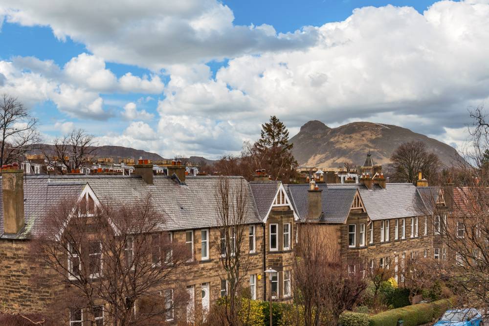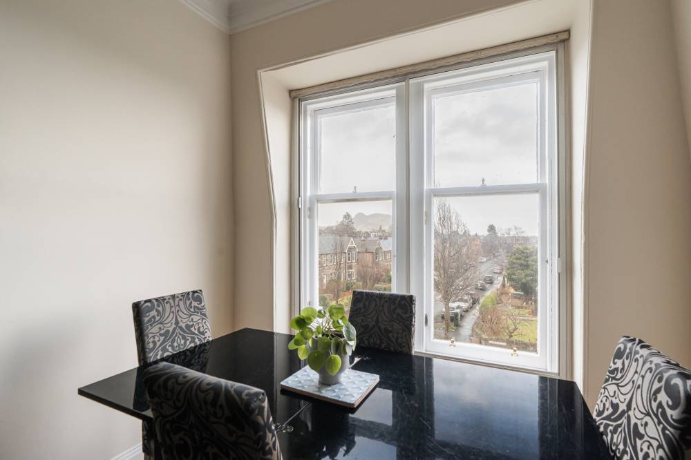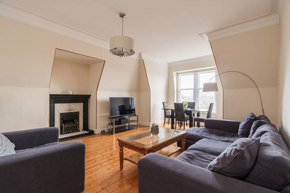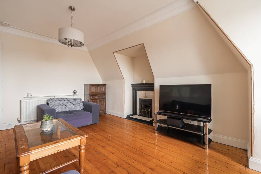 Affording a triple aspect and enjoying an abundance of natural light throughout, the property forms the full top floor of the building with exceptional open views towards Arthur’s Seat and Blackford Hill with pleasant leafy backdrop. The property would now benefit from a degree of modernisation yet offers a great opportunity for a buyer to secure a sizeable home in a great location, within easy reach of the city centre. Undoubtedly appealing to the professional person/couple or investors alike, the property comprises; shared entrance with carpeted staircase leading to the top floor landing. The welcoming entrance hall has good storage provisions with all rooms located off. There is a lovely and spacious twin-windowed lounge/diner with feature fireplace and wood floors with splendid views of Arthur’s Seat. A sizeable breakfasting kitchen again with a lovely open aspect towards Blackford Hill, features a period fireplace, wood flooring and is fitted with a range of wall and base units with built-in-hob, oven and hood. There are two generously proportioned double bedrooms, with the principal bedroom enjoying a bay window formation to the front, wood flooring and fireplace. Completing the accommodation is a partially tiled modern shower room with three piece white suite. Further benefits include a gas central heating system with recently upgraded combi boiler, sash and case window units with secondary glazing and mains wired smoke and heat detectors.