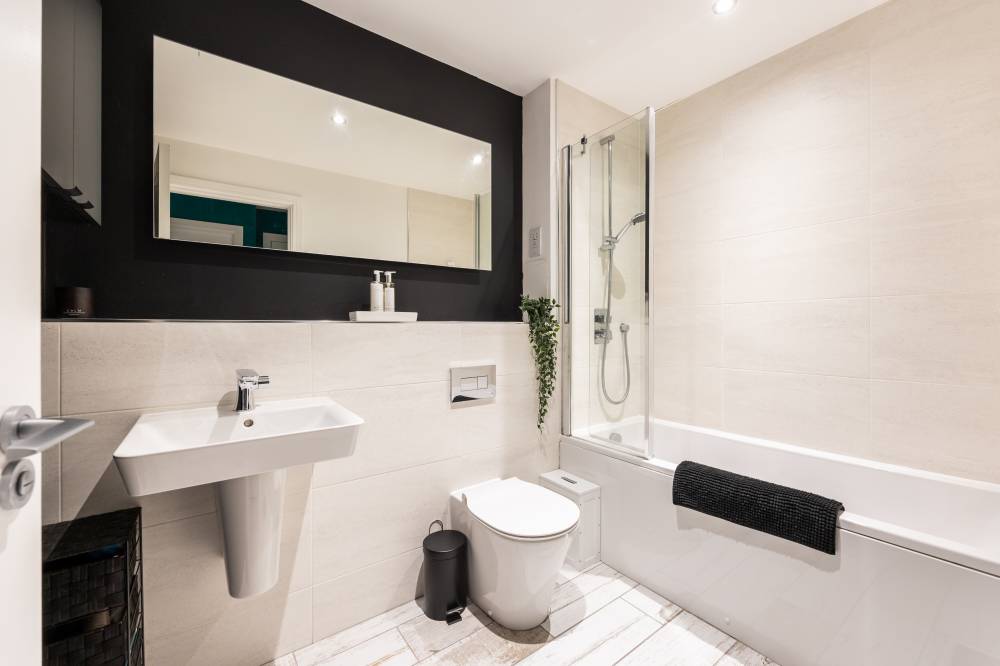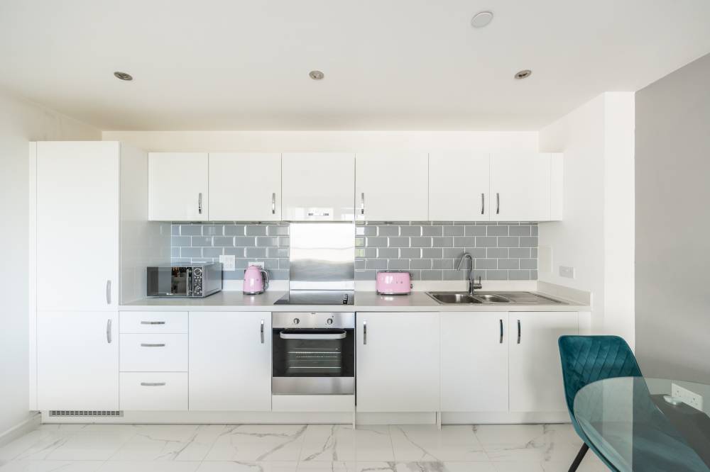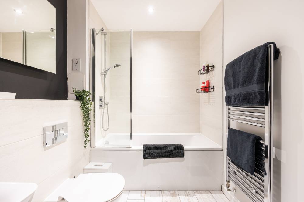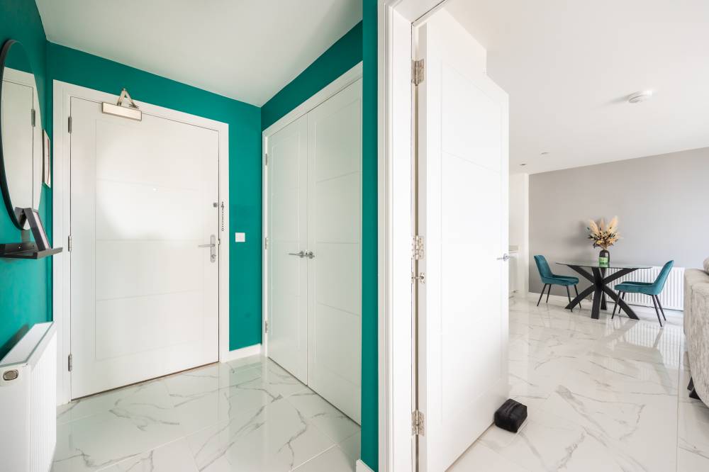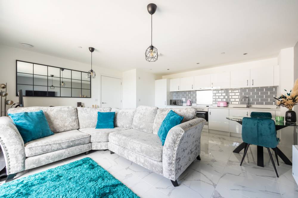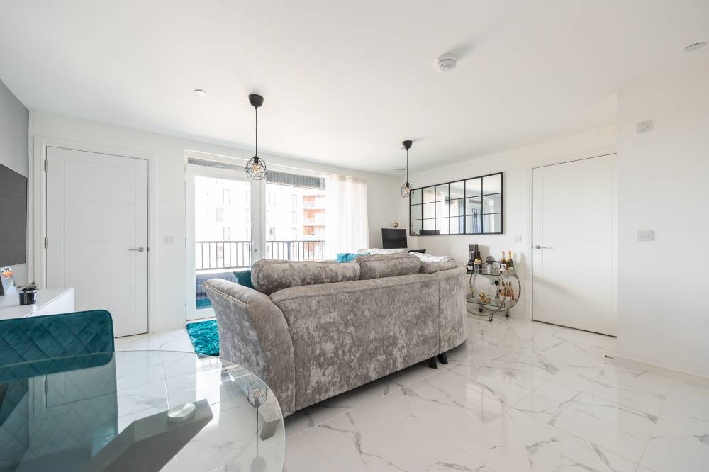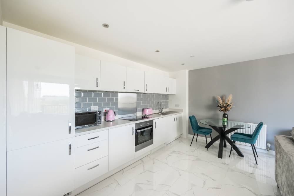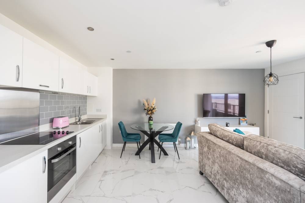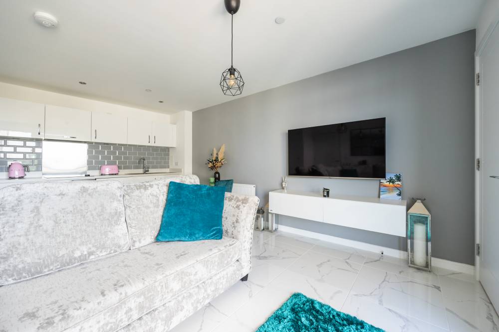 The accommodation comprises a welcoming entrance hallway with a double cupboard for storage. The bright and spacious open-plan lounge, kitchen and dining area includes a range of integrated white goods, partial tiling splash areas, tiled flooring, and mood-setting under-unit lighting. Patio doors open onto a private balcony with ample space for a small table and chairs, and there is an additional storage cupboard with shelving. The spacious double bedroom enjoys a dual aspect outlook with lovely views and features an integrated double wardrobe as well as plenty of room for freestanding furniture. The contemporary bathroom is partially tiled and includes a shower over the bath and a heated towel rail.