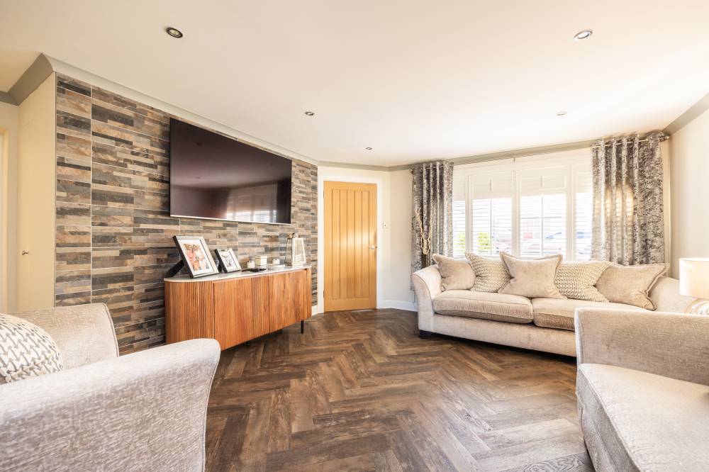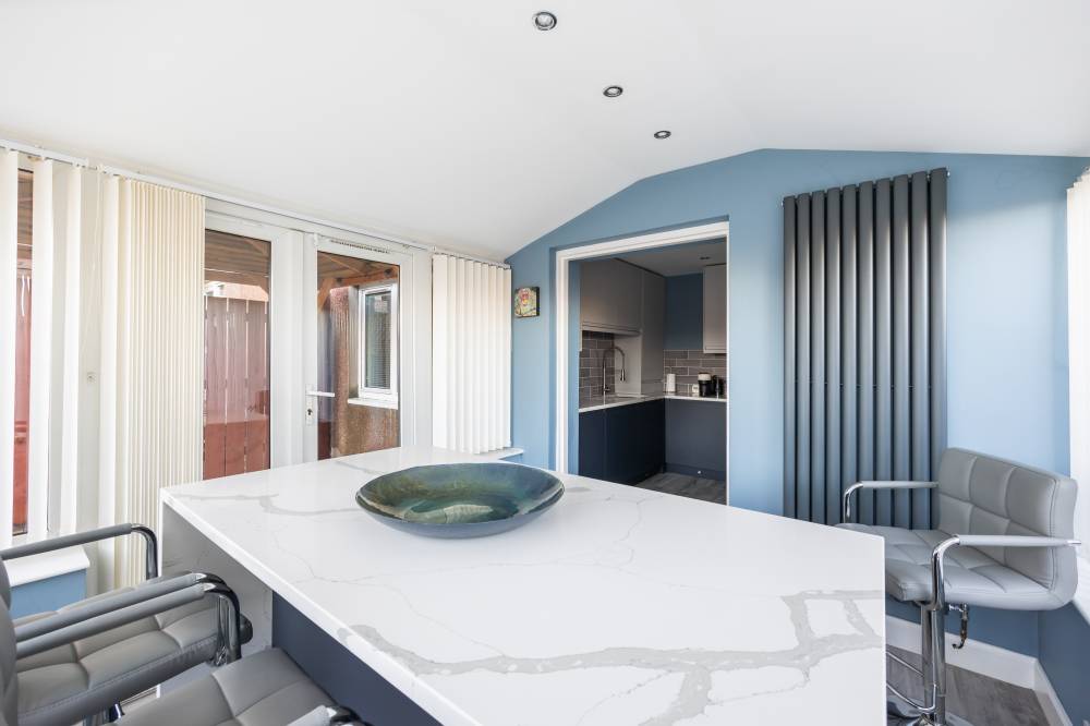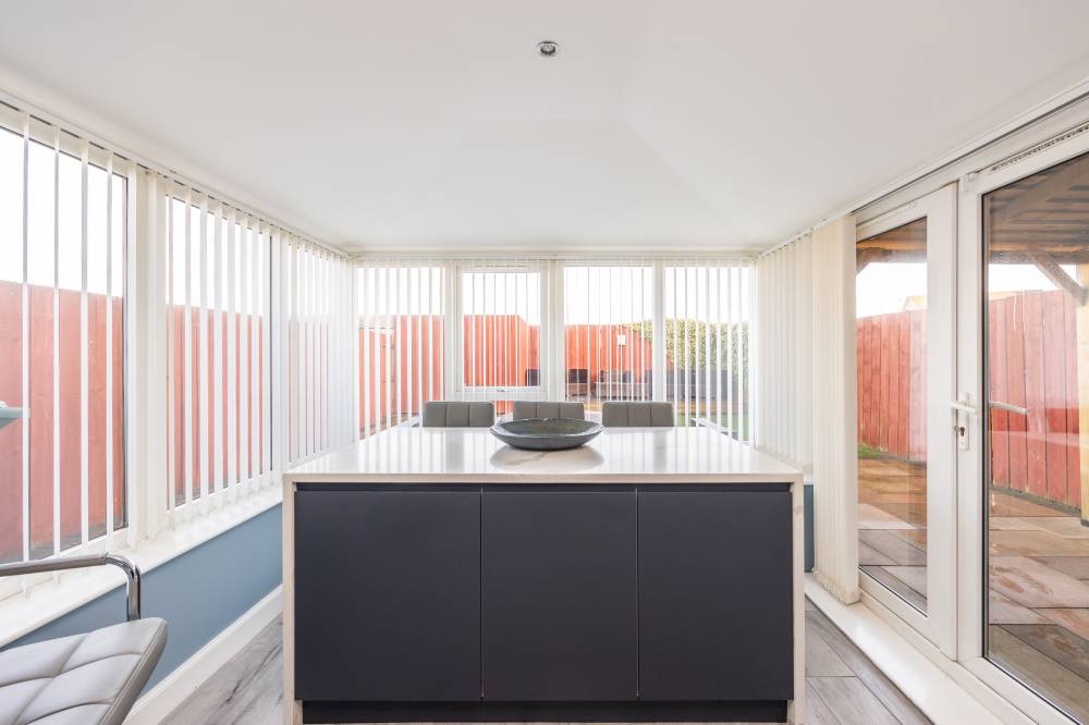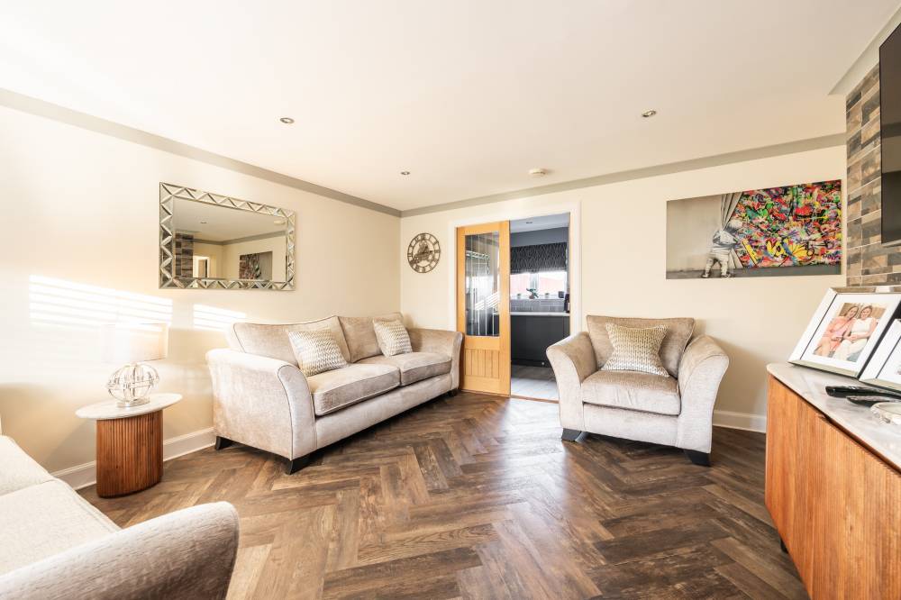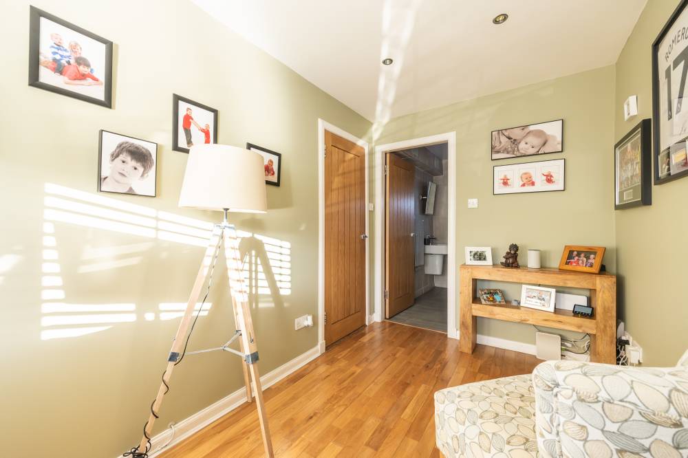 In true move in condition, the property is laid out over two levels and you enter a welcoming entrance vestibule and immediately to your left is the bright and airy lounge. Glazed doors lead through to the stylish fitted kitchen which has a range of wall and base units with co-ordinated worktops and tiled splashbacks, and this leads onto the sunroom with a breakfast bar island and a door to the garden, together providing a perfect space for cooking and entertaining. Completing the accommodation on this level is bedroom four which is currently used as a home office, and an en-suite shower room with a white suite and corner cubicle with overhead rainfall shower.