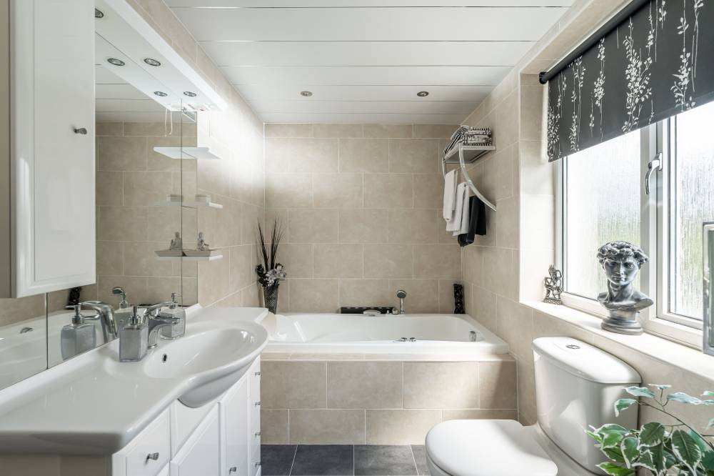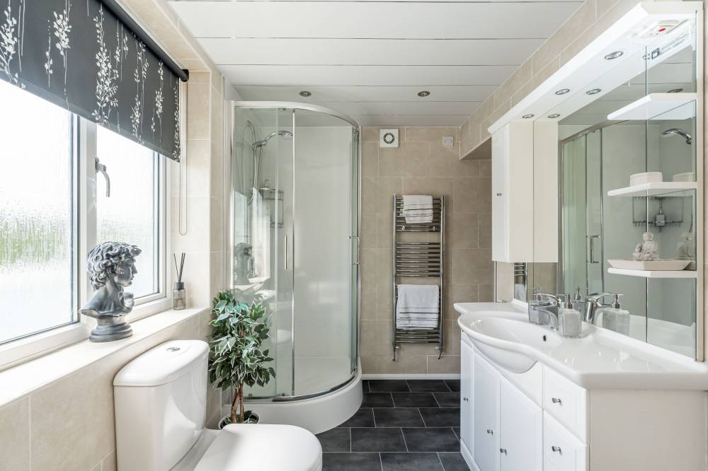 On the upper floor the hallway houses a substantial storage cupboard and there are two large dual facing double bedrooms with built-in storage, together with a modern family bathroom comprising countertop sink, vanity unit with downlighters, WC, bath, and separate shower enclosure with mains shower and splash back.