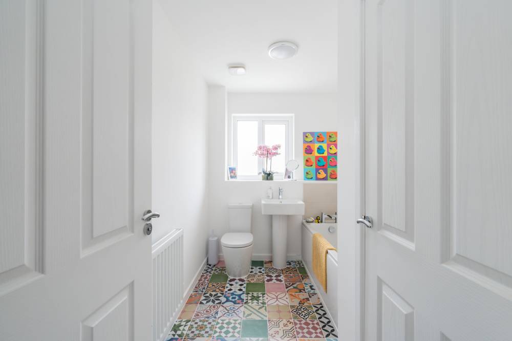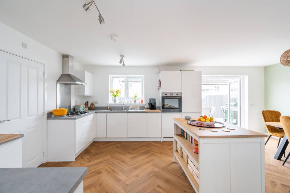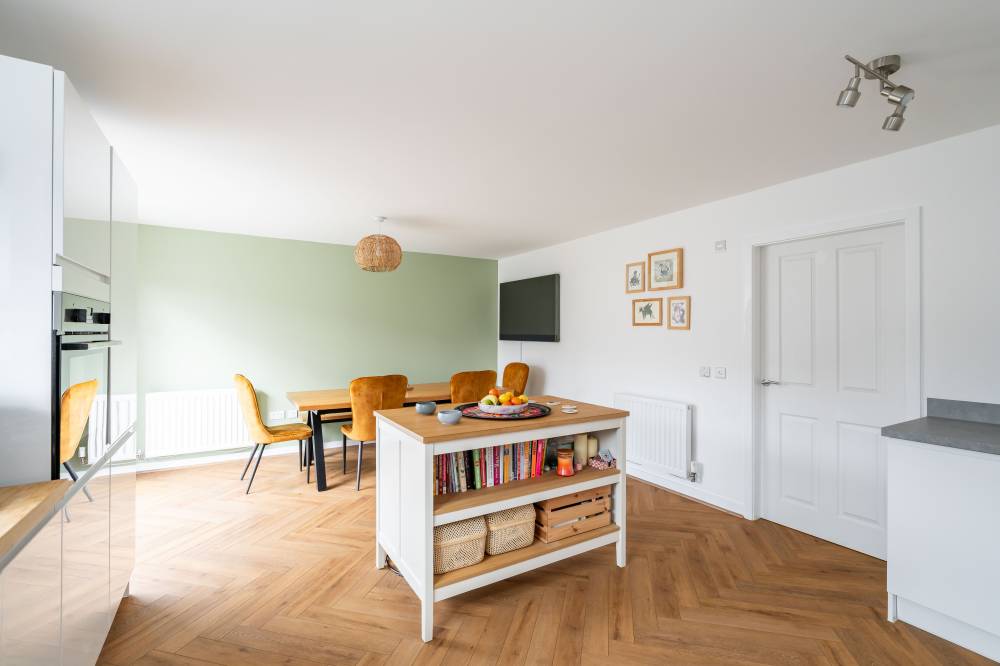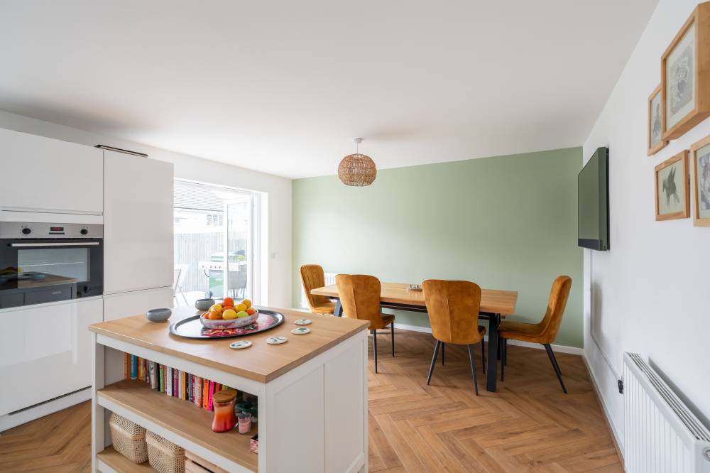 In true move in condition throughout, you enter a welcoming entrance hall with understairs storage, and to your right is a bright and airy lounge with a box bay window. Moving to the rear there is an impressive and spacious dining kitchen providing a superb space for cooking and entertaining. There is a range of sleek white wall and base units with co-ordinated worktops, and French doors lead out to the rear garden. Off the kitchen is a useful utility room with a door to the garden, and a handy WC.