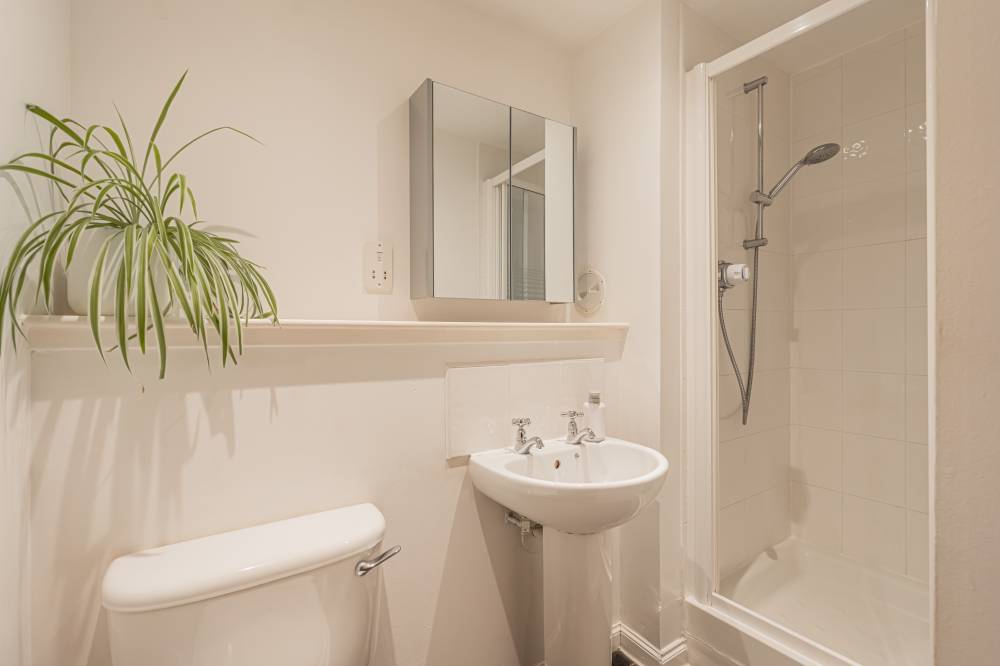 The principal bedroom is warm and inviting, finished with soft carpeting and offering generous built-in wardrobes for convenient storage. It also benefits from a sleek en-suite shower room, providing added privacy and comfort. The second double bedroom is slightly larger and also includes built-in wardrobes, making it ideal as a guest room, home office, or for a growing family. The main shower room continues, features a modern two-piece white suite, a spacious walk-in shower, and a heated chrome towel rail.