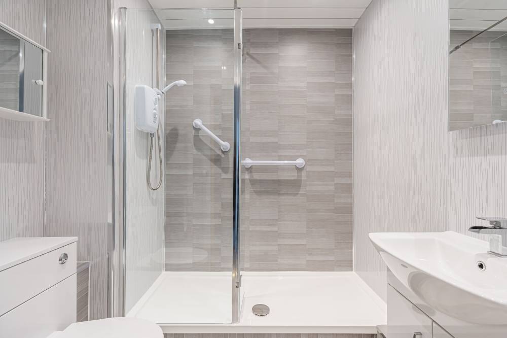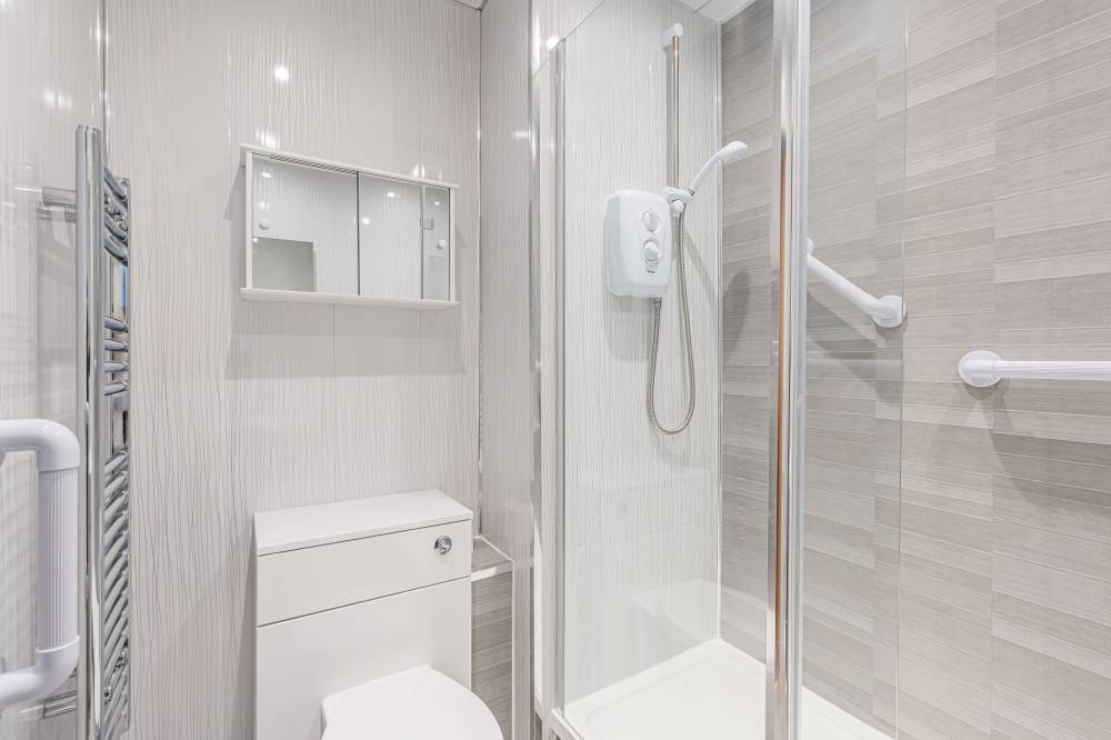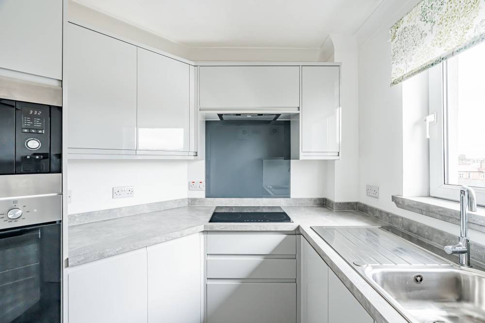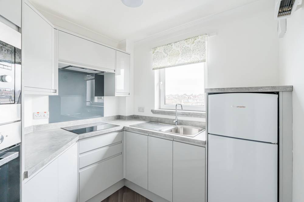 The accommodation briefly comprises: entrance hallway with good sized built-in storage cupboard, generously proportioned reception/dining room with carpeted floor, fresh neutral décor and a pleasant open outlook, modern kitchen fitted with a variety of sleek contemporary units, with coordinated worktops, glass splash back and a selection of integrated appliances, spacious double bedroom with fitted wardrobes, and stylish shower room with WC, basin/storage unit and mains shower enclosure.