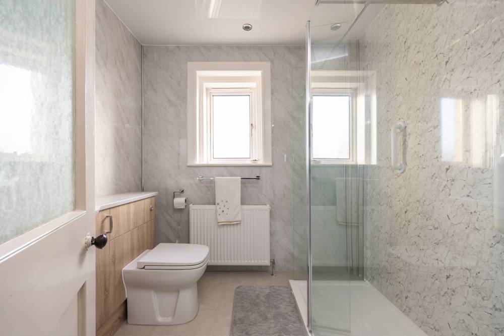 A welcoming vestibule, complete with the original tiled floor, leads into a spacious inner hallway with useful storage and a ground-floor WC. To the rear, a bright and versatile reception room provides ample space for both relaxation and formal dining, enhanced by sliding glass doors which open directly onto the rear garden. The large kitchen, offers a good selection of fitted wall and base units, generous worktop space, and room for free-standing appliances, with direct access to the garden for added convenience. To the front of the property, a versatile public room lends itself perfectly as a lounge, a dining room or a fourth bedroom. The upper floor is home to three well-proportioned bedrooms. The principal bedroom enjoys a charming bay window to the front, in-built storage and a bright, airy feel. Two further bedrooms are set to the rear, both benefiting from wonderful open aspects over the rear garden and uninterrupted views towards King George V Park. One is a particularly spacious double with fitted wardrobes, while the other is a comfortable compact double and would be ideal as a home office. A modern shower room completes the accommodation, fitted with full easy-care wet wall, a stylish two-piece suite with vanity storage, and a large walk-in glass cubicle with dual-headed thermostatic shower. Set within the heart of Bonnyrigg, this appealing family home combines space, character and a highly convenient location, making it a rare opportunity not to be missed.