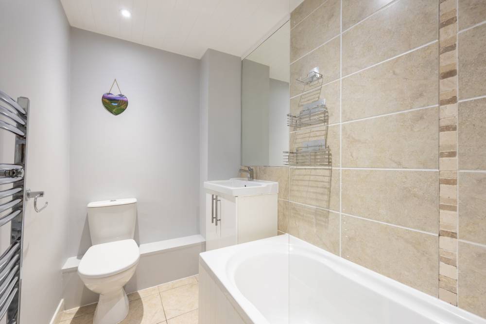 The accommodation briefly comprises: comfortable south facing reception room with attractive wood flooring, neutral décor and a focal stair leading to the upper level, contemporary dining kitchen which has been fitted with an excellent range of white base and wall mounted units, with coordinated worktops, integrated appliances and space for a dining table and chairs, bright and well proportioned principal bedroom with fitted mirrored wardrobes, second good sized double bedroom with an impressive open aspect, and modern family bathroom with tasteful neutral décor, splash tiling, three piece white suite and over-bath shower.