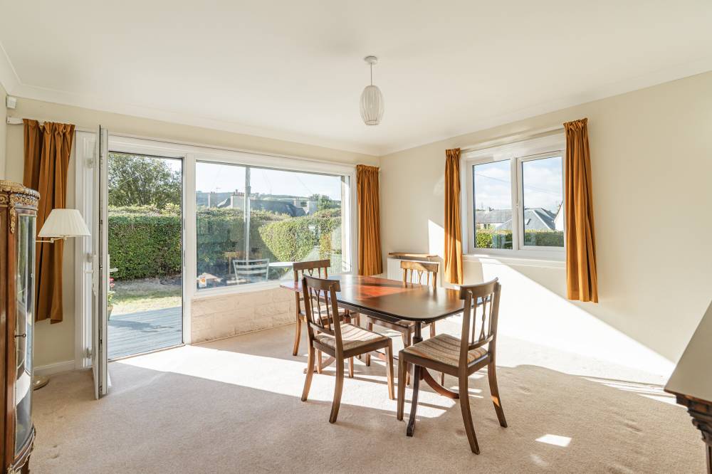 Laid out over one level, the property is entered via a welcoming vestibule with cloaks cupboard and hallway. The bright dual-aspect lounge provides a comfortable space to relax, with a feature stone fireplace and a living flame gas fire creating a natural focal point. The kitchen is fitted with a range of wall and base units with co-ordinated worktops and tiled splashbacks and provides direct access to the side of the home. The dual aspect principal bedroom (currently set as a dining room) has French door opening directly onto the rear garden, offering a wonderful connection to the outdoors. Two further double bedrooms are both enhanced by built-in wardrobes, while the shower room is finished with a white suite, heated towel rail and overhead rainfall shower. An attic, accessed via Ramsay ladder, provides useful additional space for storage and the property further benefits from gas central heating and double glazing.