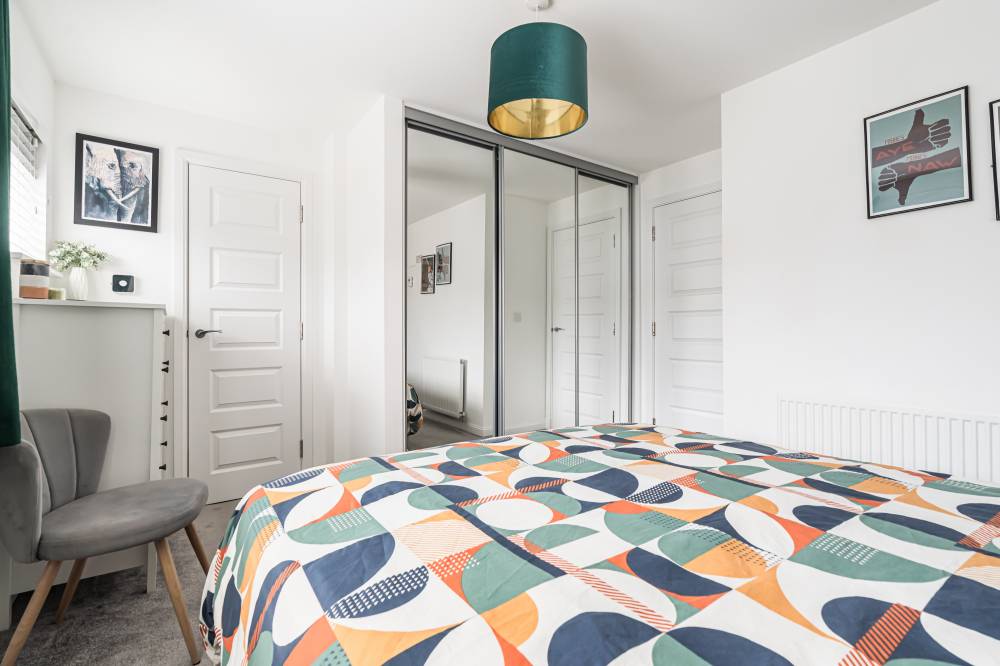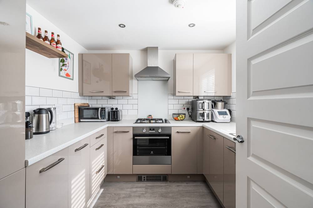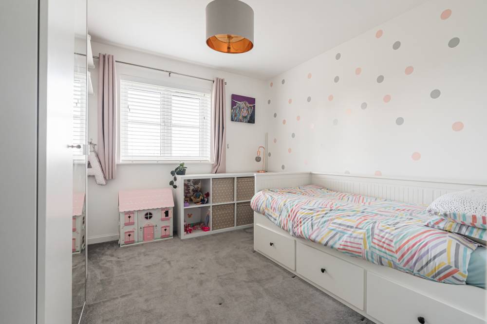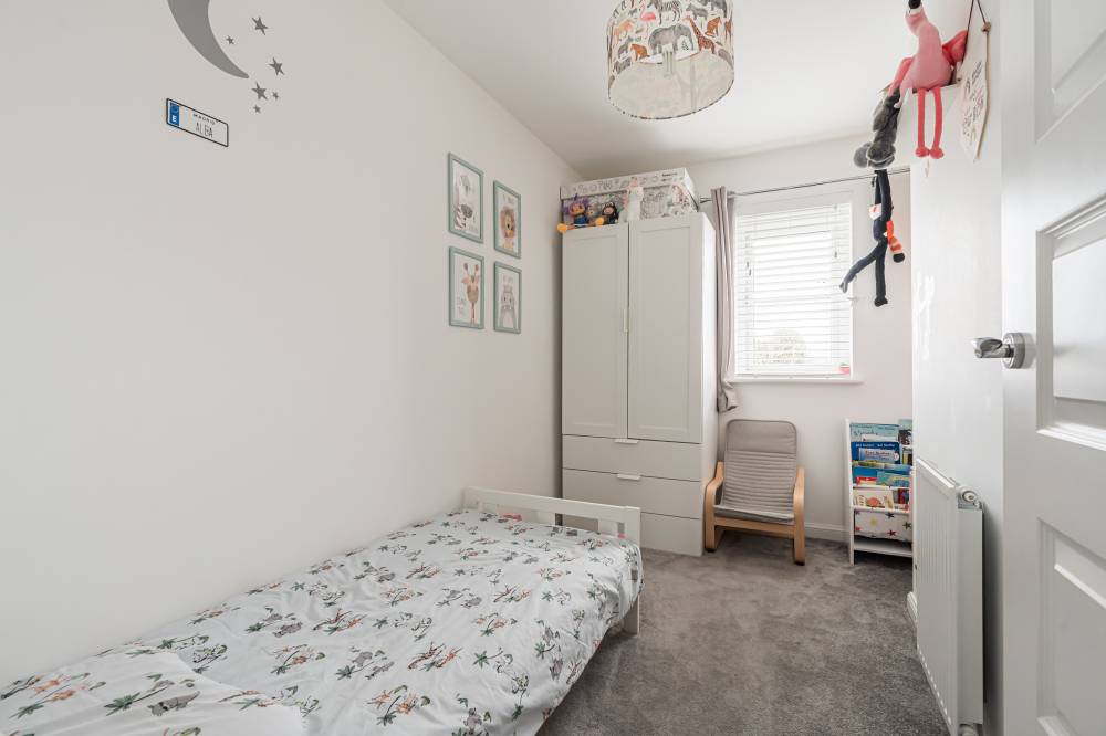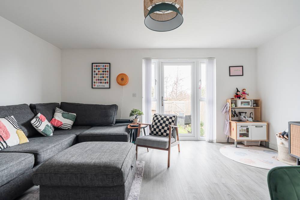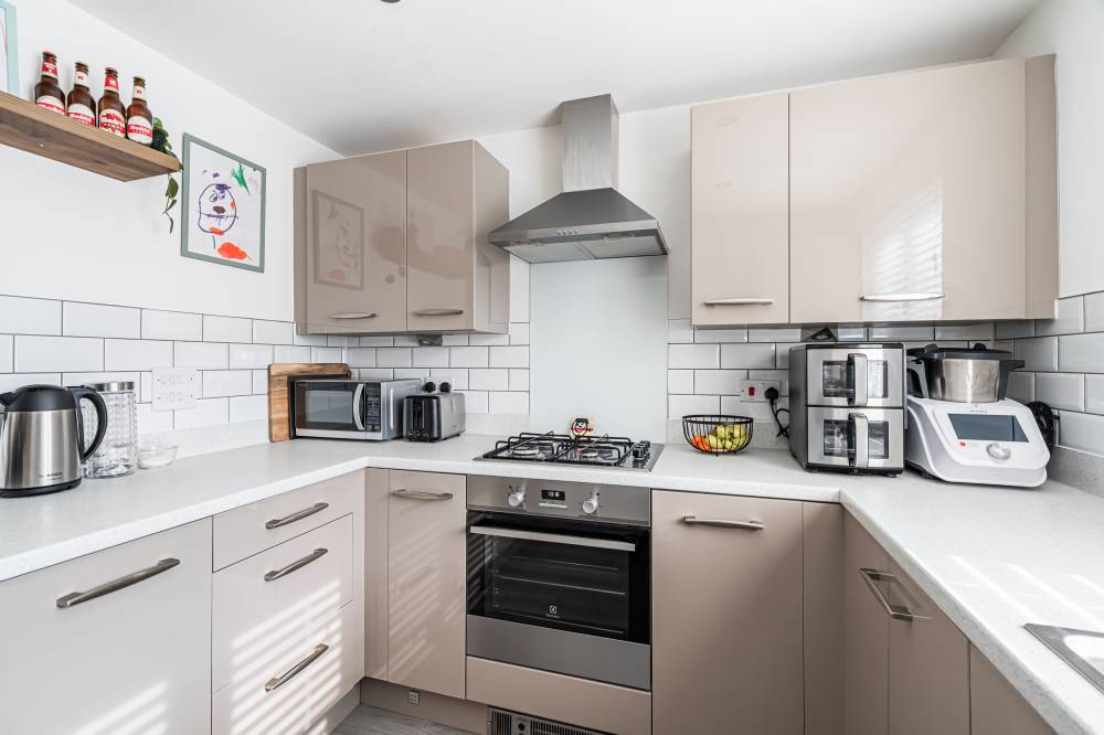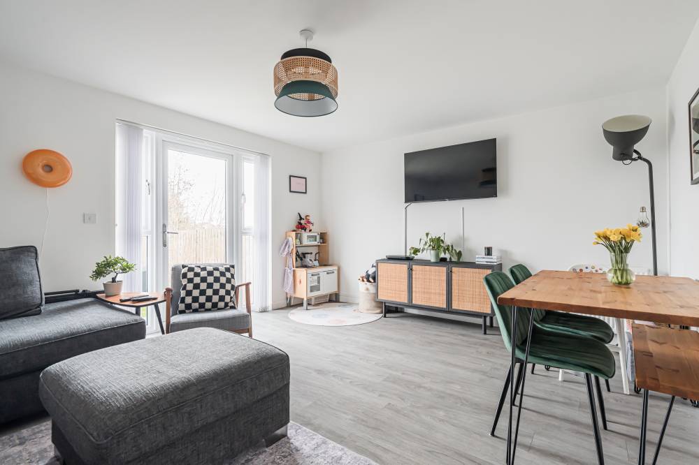 The property opens into a welcoming entrance hallway with staircase leading to the upper level and a convenient WC. The kitchen is fitted with a modern selection of stylish wall and base units, complemented by contrasting worktops and integrated appliances, offering a practical and attractive space for daily living. To the rear, the reception room is bright and spacious, featuring patio doors that open directly onto the fully enclosed rear garden, creating a seamless indoor-outdoor flow ideal for family life and entertaining. Upstairs, the principal bedroom benefits from good built-in storage, while the second bedroom is a generous double. A further single bedroom provides flexibility for a nursery, home office, or guest accommodation. The contemporary family bathroom has been fitted with a three-piece white suite, including a bath with over-bath shower and glass splash screen, combining functionality with modern design.