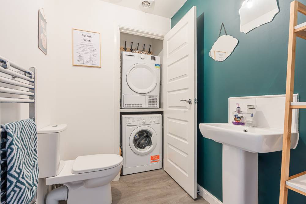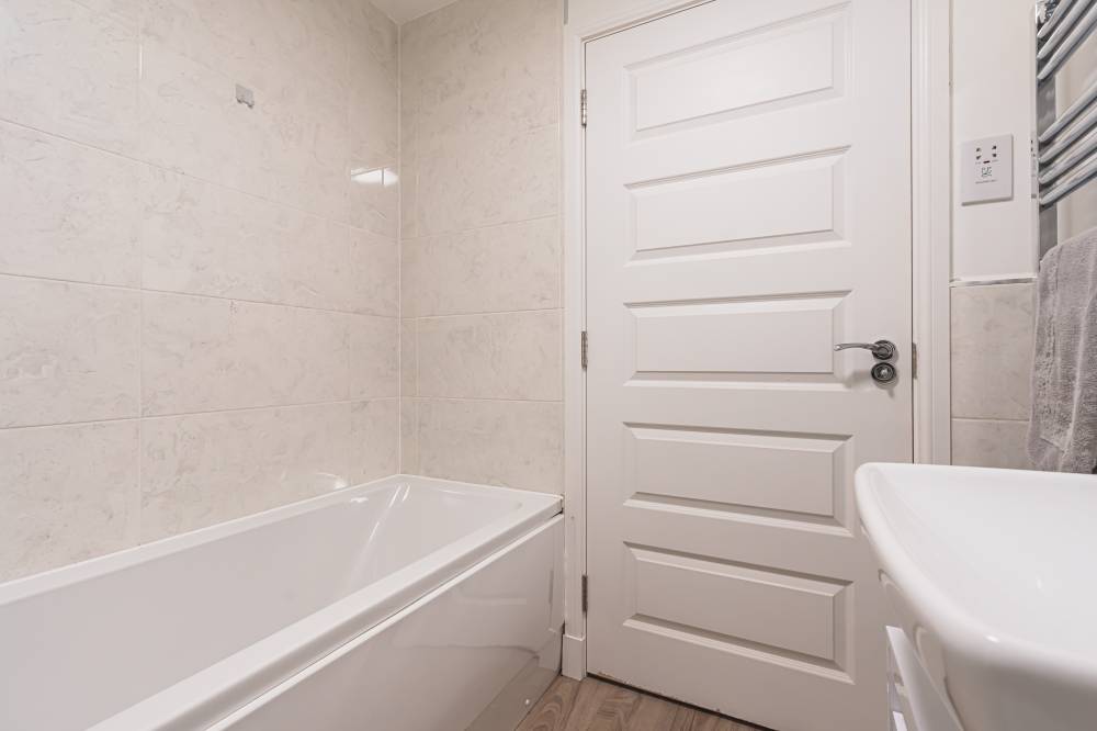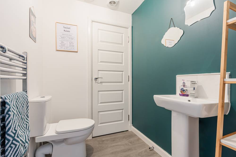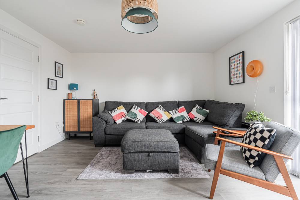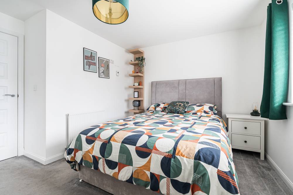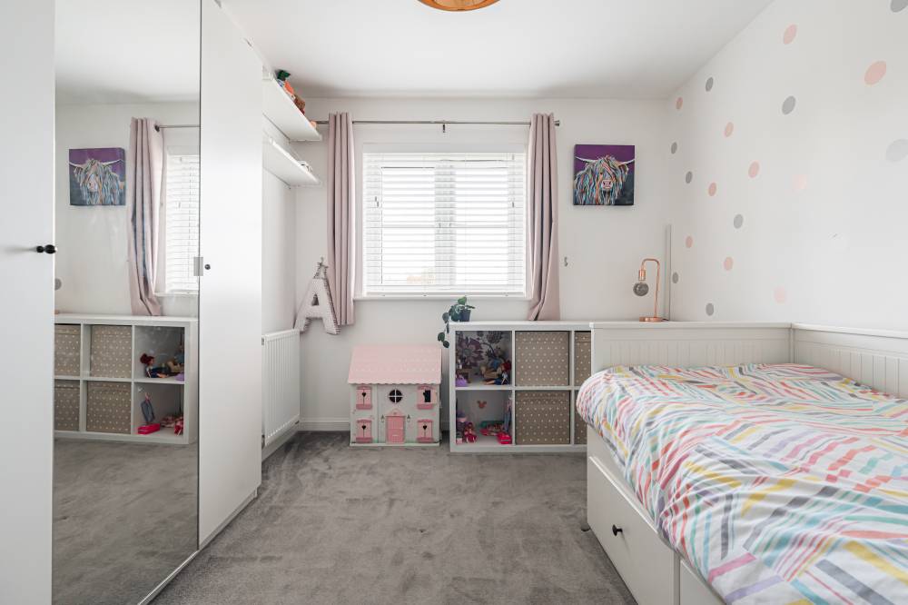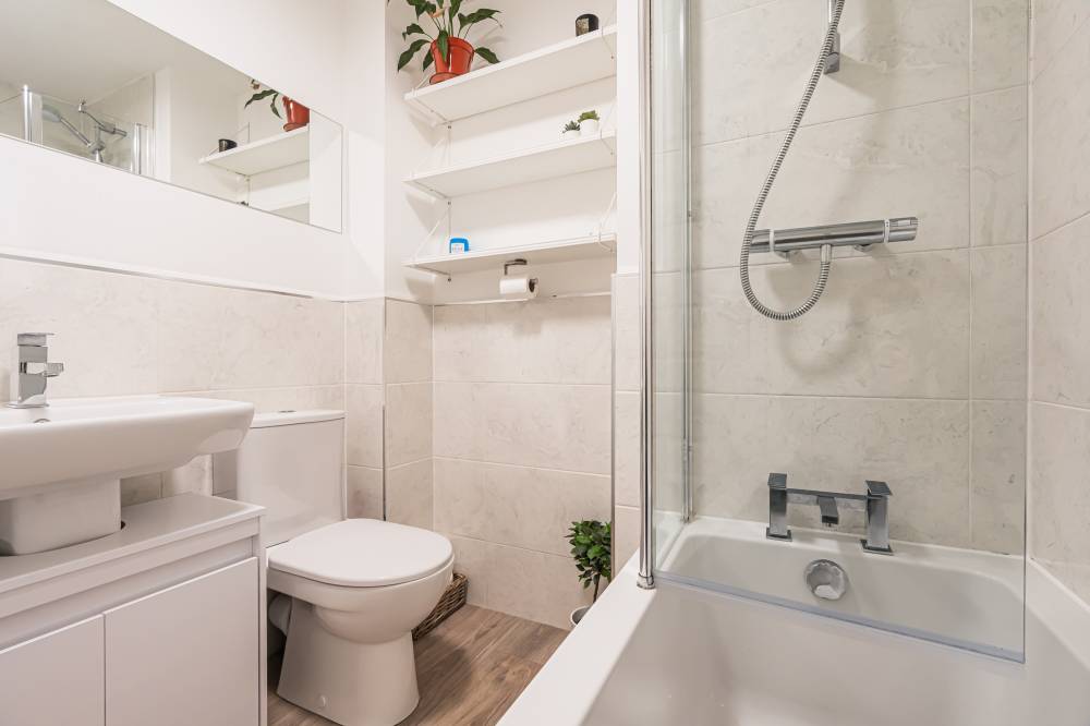 The property opens into a welcoming entrance hallway with staircase leading to the upper level and a convenient WC. The kitchen is fitted with a modern selection of stylish wall and base units, complemented by contrasting worktops and integrated appliances, offering a practical and attractive space for daily living. To the rear, the reception room is bright and spacious, featuring patio doors that open directly onto the fully enclosed rear garden, creating a seamless indoor-outdoor flow ideal for family life and entertaining. Upstairs, the principal bedroom benefits from good built-in storage, while the second bedroom is a generous double. A further single bedroom provides flexibility for a nursery, home office, or guest accommodation. The contemporary family bathroom has been fitted with a three-piece white suite, including a bath with over-bath shower and glass splash screen, combining functionality with modern design.