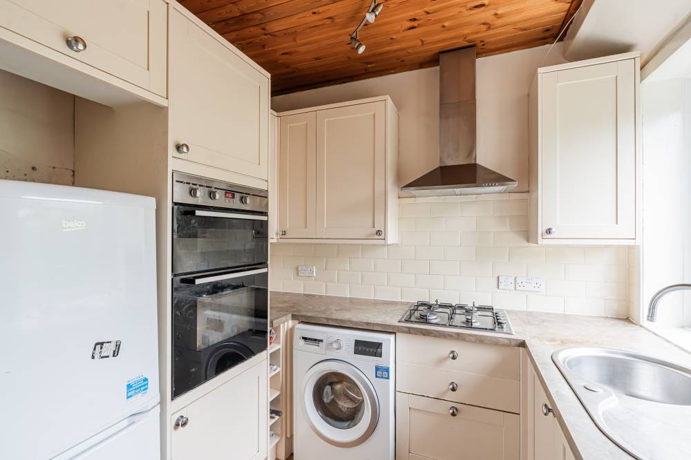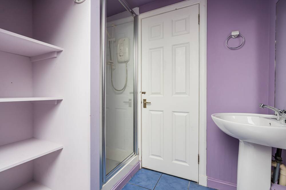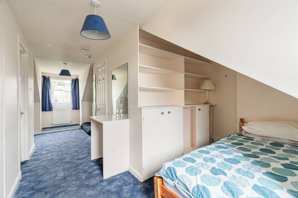 The property opens with a welcoming entrance staircase leading into the bright and airy lounge/diner, a comfortable living space enhanced by a shelved press cupboard, a gas fireplace, and a large walk-in storage cupboard. The fully fitted kitchen is neatly presented, with a range of integrated white goods included and tasteful splash tiling providing a practical finish. Two double bedrooms are located on this level, both offering excellent built-in storage. Bedroom two includes mirrored sliding wardrobes and an understairs cupboard, while bedroom three benefits from wall-to-wall integrated wardrobes, making the most of the available space. The bathroom is fully tiled and features a shower-over-bath setup. The upper floor is home to a generous principal suite, a versatile and light-filled room with dual-aspect windows, eaves access, and built-in shelving. A private en-suite completes the space, with a Velux window, tiled flooring, and a single shower enclosure.