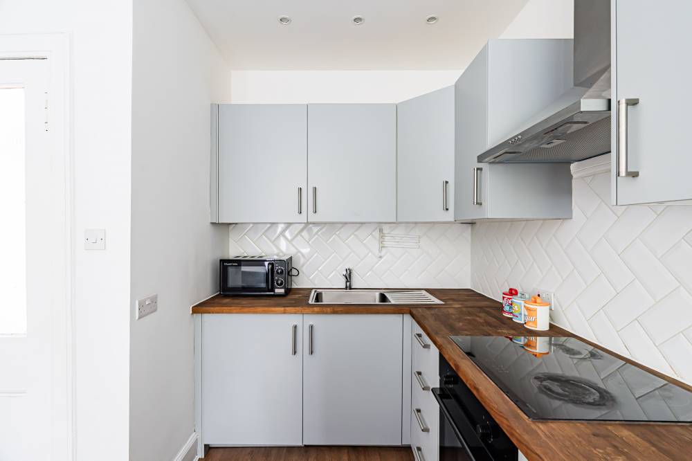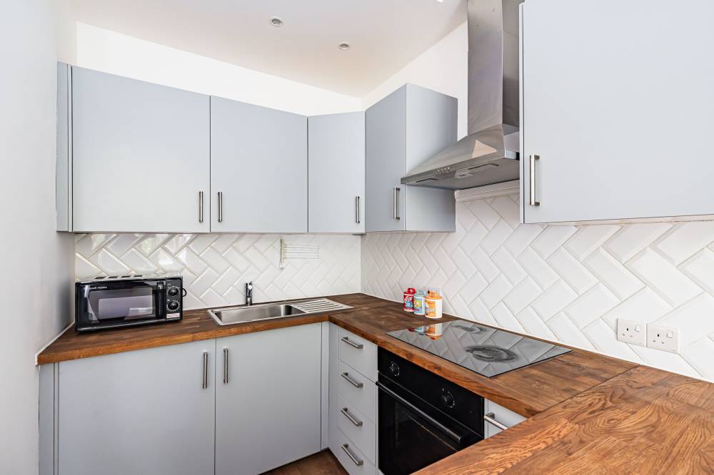 The accommodation begins with a welcoming hallway leading into a spacious open-plan lounge, kitchen, and dining area. This bright and sociable space benefits from wooden worktops, some integrated white goods, partial wall tiling, and a traditional Edinburgh Press cupboard. A rear aspect outlook provides a peaceful setting, complemented by a useful rear storage room with shelving and a separate utility cupboard.