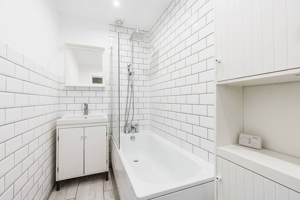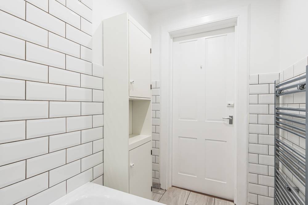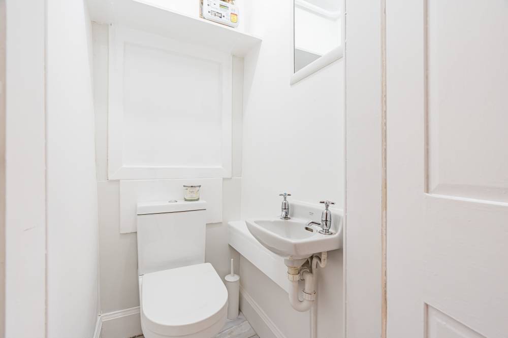 The property includes a separate WC with tiled flooring and a two-piece suite, as well as a stylish bathroom with a partially tiled finish, tiled floor, heated towel rail, and a rain shower over the bath.