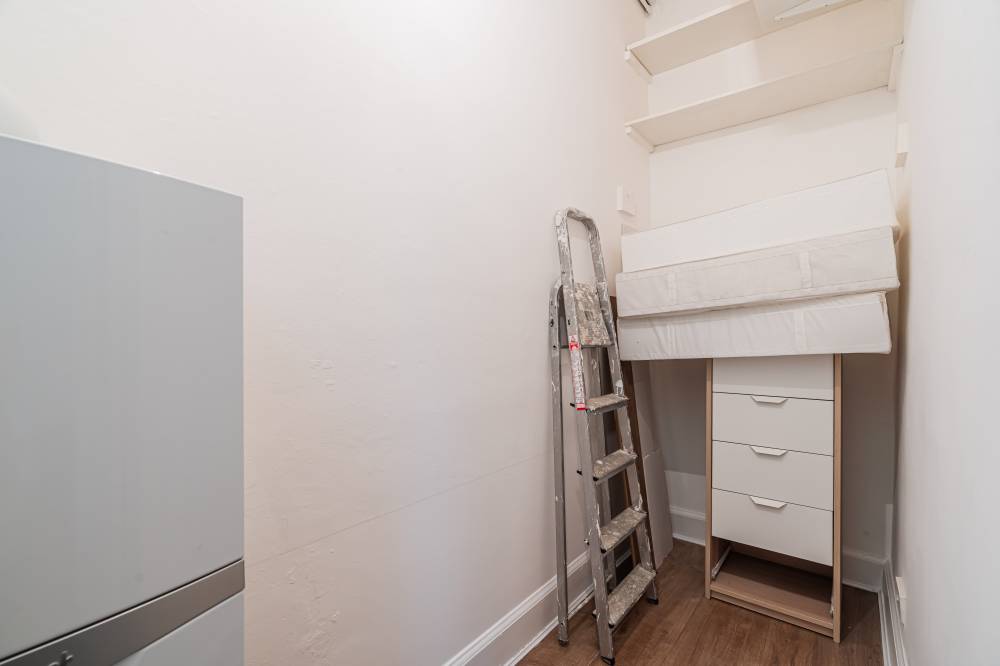 The principal bedroom is a generous double, featuring working shutters, decorative cornicing, and a shelved press for added storage. The second bedroom is also a double, complete with under-window storage and shutters, making it ideal as a guest room, home office or nursery.