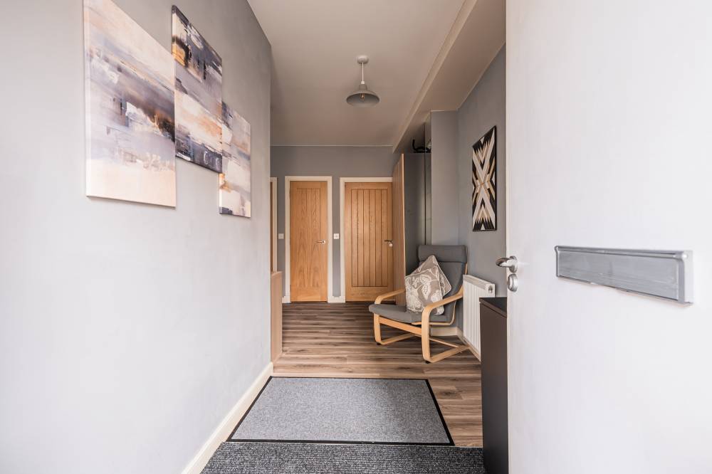 Accessed via its own private main door, the flat opens into a bright and welcoming open-plan lounge, kitchen, and dining area. Triple windows frame a lovely open outlook over the canal, filling the space with natural light and providing a tranquil backdrop. The kitchen is fitted with a range of integrated and freestanding white goods, partially tiled in splash areas for easy maintenance, and offers flexibility for a variety of furniture layouts. The good-sized double bedroom enjoys the same peaceful canal views and offers ample room for freestanding furniture. A neutral bathroom with tiled flooring, partial wall tiling, and a shower-over-bath completes the accommodation.