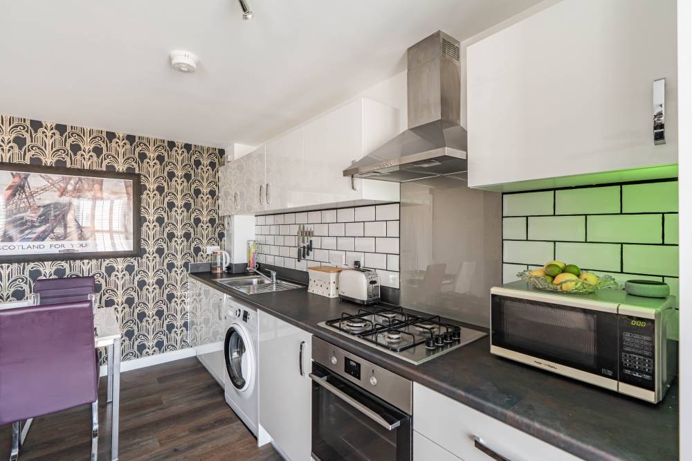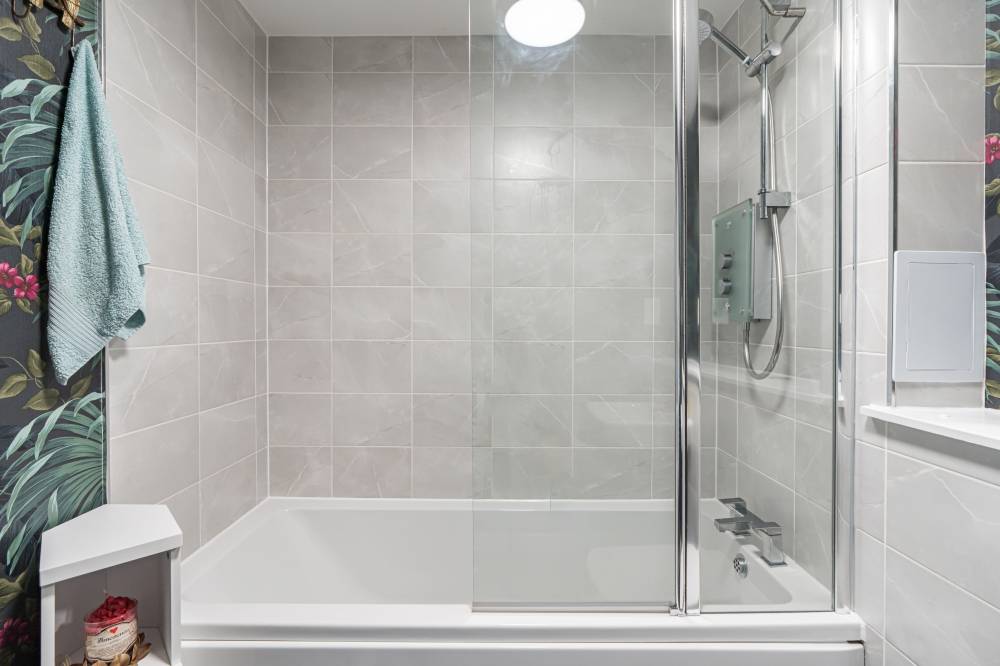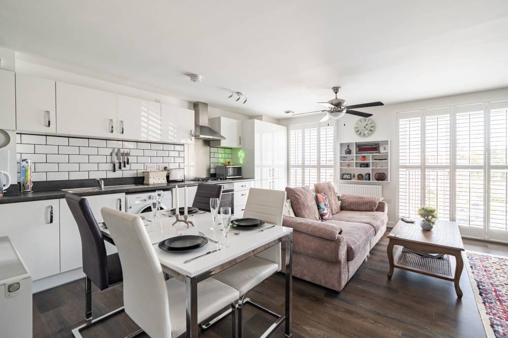 A welcoming entrance hallway with a generous storage cupboard leads to the spacious open-plan lounge, kitchen, and dining area. This bright and versatile living space allows for various layout options and features elegant fitted window shutters and a Juliet balcony. The contemporary kitchen is well-equipped with a range of integrated and freestanding white goods whilst splashback tiling adds a stylish, practical touch. The main bedroom is a good-sized double, complete with built-in mirrored wardrobes, another Juliet balcony, and lovely open views. The second bedroom, also a double, enjoys a rear-facing aspect and is ideal as a guest room or home office. A well-appointed bathroom features a shower-over-bath, heated towel rail, and partial wall tiling for a sleek finish.