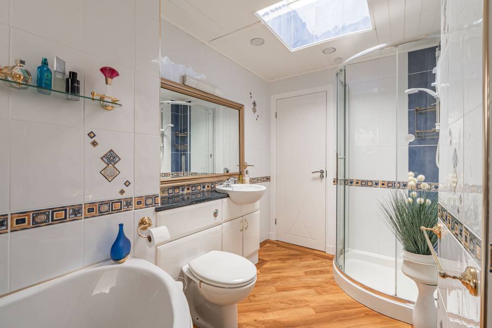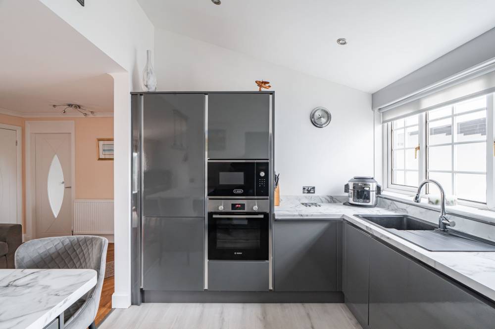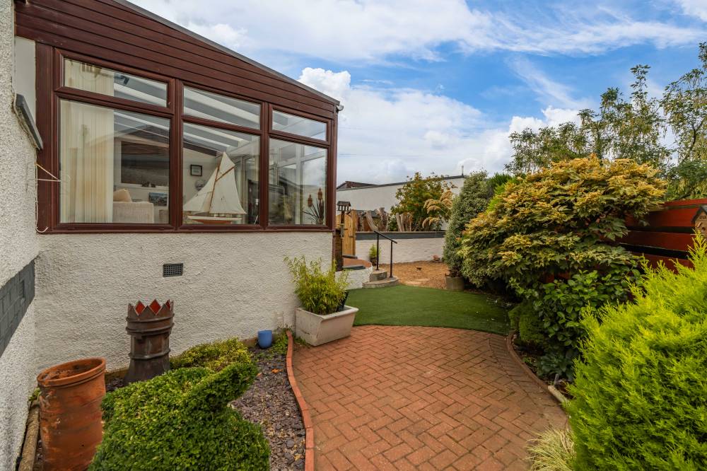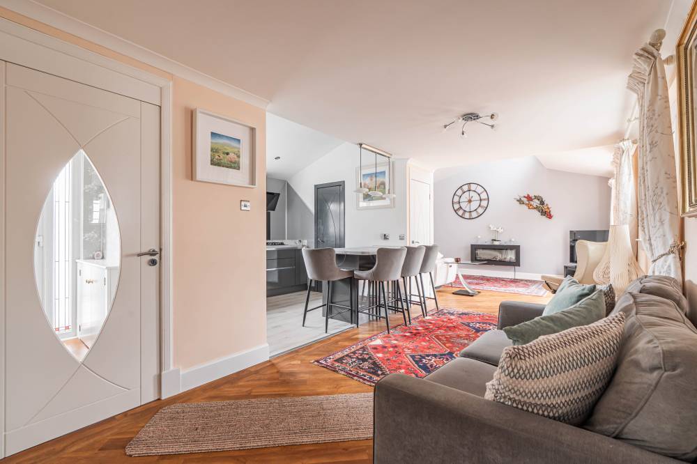 A welcoming entrance vestibule leads into a striking open-plan living space, with a vaulted ceiling and patio doors opening directly onto the rear garden. The kitchen/breakfast area is positioned to the front, featuring contemporary wall and base units with integrated appliances including a fridge freezer, washing machine, gas hob, electric oven and microwave. A generous walk-in pantry houses the tumble dryer (included) and the combi boiler, while the open-plan layout allows for space for both living and dining furniture, with the living room area featuring an electric flame effect fire. The accommodation seamlessly connects to a bright conservatory offering flexible use and enjoying a sunny southerly aspect with direct garden access. An inner hallway separates the living area from the private accommodation. The principal bedroom is a substantial double with extensive built-in wardrobes and storage, while the second double bedroom also benefits from fitted wardrobes. The large family bathroom is finished with a modern four-piece suite, including a bath, separate walk-in shower and vanity storage. The property further benefits from gas central heating, full modern double glazing and ample built-in storage throughout.
