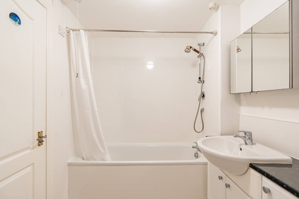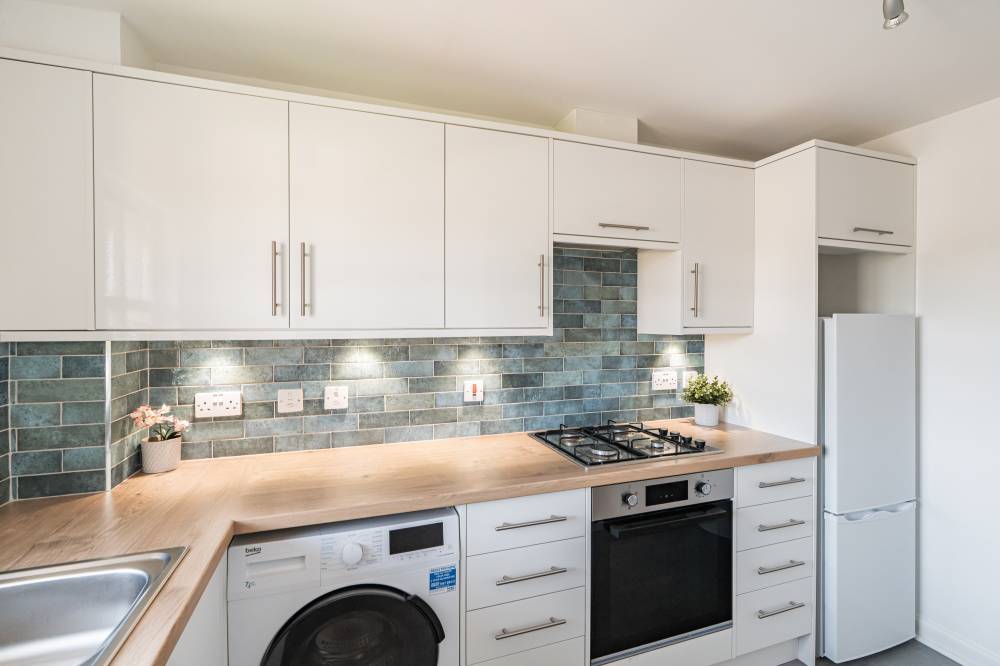 Forming part of a well-maintained modern development, the property is presented in true move-in condition, a welcoming entrance vestibule leading into a welcoming hallway with three generous built-in storage cupboards and hatch access to a partially floored loft, providing additional storage space. A bright and spacious twin-windowed living/dining room enjoys an open aspect to the front and leads through to a newly fitted breakfasting kitchen. The kitchen features a stylish range of wall and base units with ceramic tiled splashback, integrated oven, hob, cooker hood, and slimline dishwasher. A washer/dryer and fridge freezer are also included in the sale. To the rear lies a peaceful double bedroom with built-in wardrobes, while a contemporary bathroom with white suite, over-bath shower, new flooring, towel rail, and cabinet completes the accommodation.