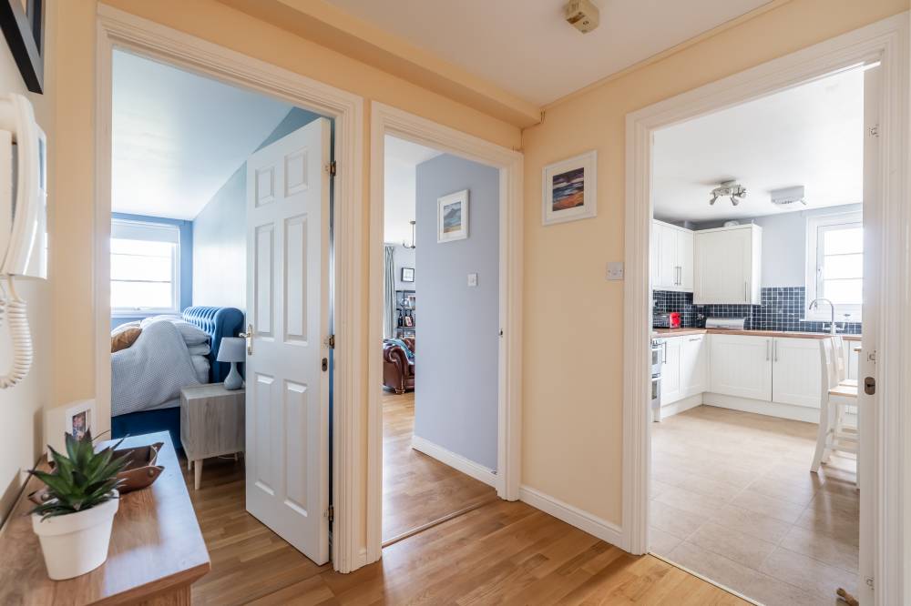 In true move in condition, you access from a well maintained communal entrance and stairway with video entry system into a welcoming hallway which leads to a bright and spacious dual aspect lounge/dining room with gas fire, and two balconies offering the ideal place to relax with morning coffee and dine in the warmer months. The breakfasting kitchen has a good range of wall and base units with wooden worktops, splashback tiling and integrated appliances. There is a generous principal bedroom with built in wardrobes running the full length of the room and an en-suite shower room with a white suite and heated towel rail. Bedroom two is also a good size double bedroom with a built in wardrobe, and completing the accommodation is a partially tiled bathroom with a shower over the bath. The property further benefits from gas central heating and double glazing.