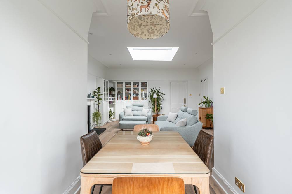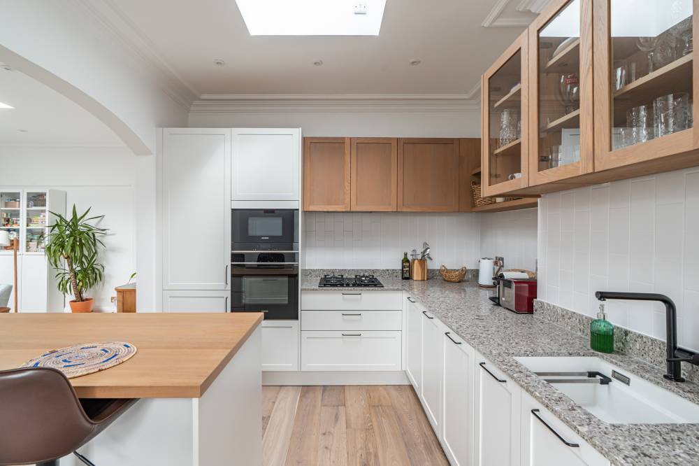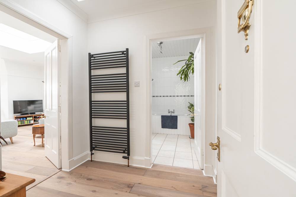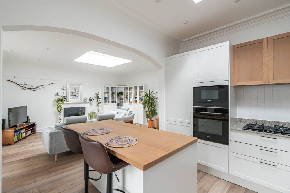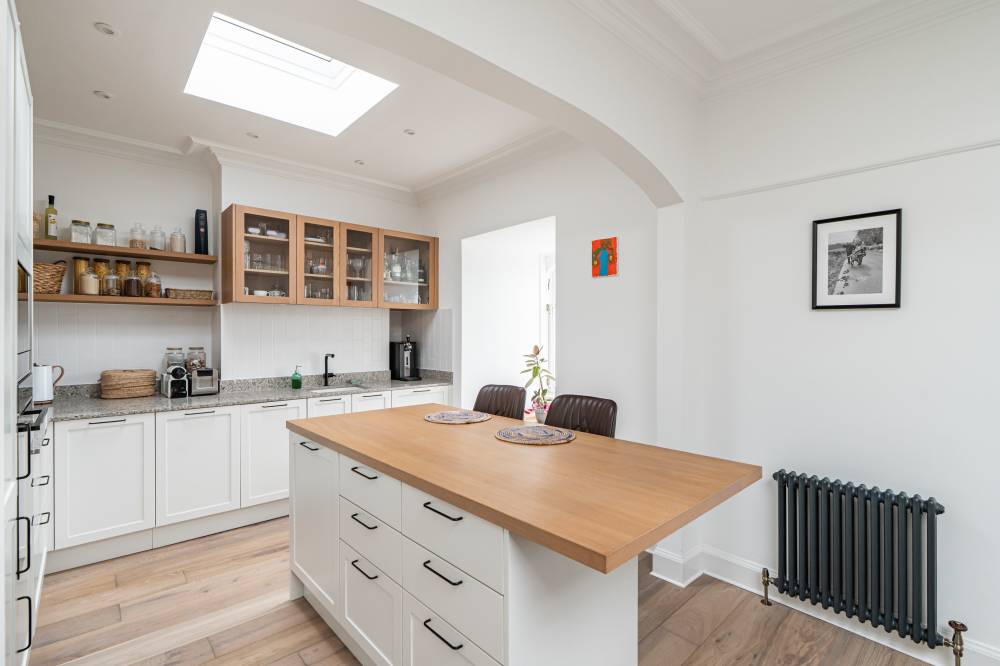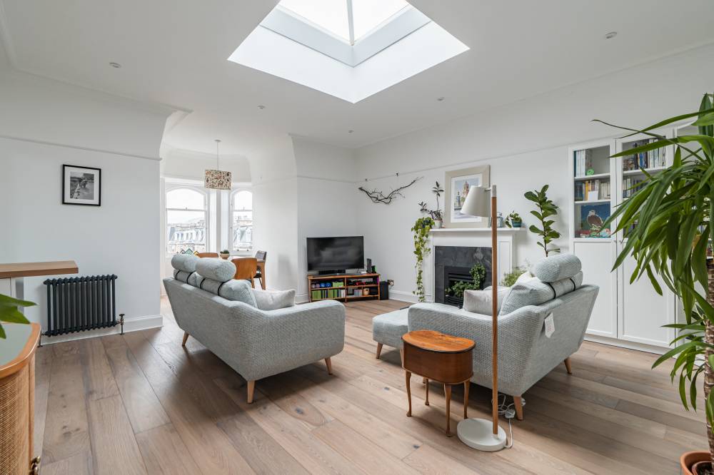 Accessed via a secure and well-maintained communal entrance, this beautifully presented home opens into a welcoming hallway that leads to a stunning open-plan lounge, kitchen, and dining area—the true heart of the property. The lounge boasts a large bay window that floods the space with natural light, a decorative fireplace, a storage cupboard, and ample room for a dining table. Skylights in both the lounge and kitchen area further enhance the bright and airy atmosphere. The bespoke kitchen is thoughtfully designed with an extensive range of oak wall and base units, silestone worktops, tiled splashbacks, and a central island offering additional storage and a casual dining space. At the opposite end of the hallway are two generously sized double bedrooms, each featuring built-in storage. The accommodation is completed by a partially tiled bathroom, fitted with a white suite, a heated towel rail, and a shower over the bath. Additional features include gas central heating, double-glazed sash and case windows, and elegant oak flooring throughout the hallway and main living area.