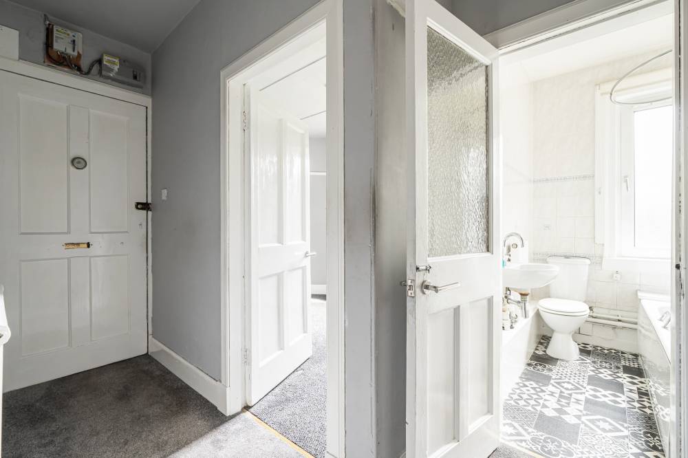 A welcoming entrance hallway leads into the bright and airy lounge/diner, enhanced by twin windows, a capped gas fire with decorative surround, and a cupboard housing the boiler. The kitchen is fitted with a range of integrated white goods, complemented by gloss white units, a contrasting dark worktop, and partially tiled splash areas. There are two well-proportioned double bedrooms: the front-facing principal bedroom and a rear-facing second double bedroom. Both offer flexible layouts with ample room for freestanding furniture. The bathroom is fully tiled and fitted with a bath suite.