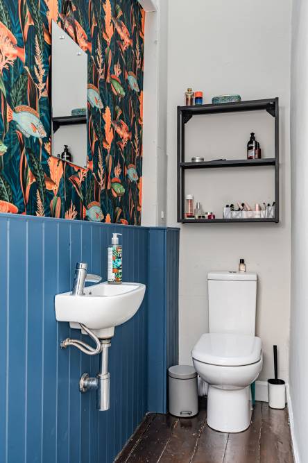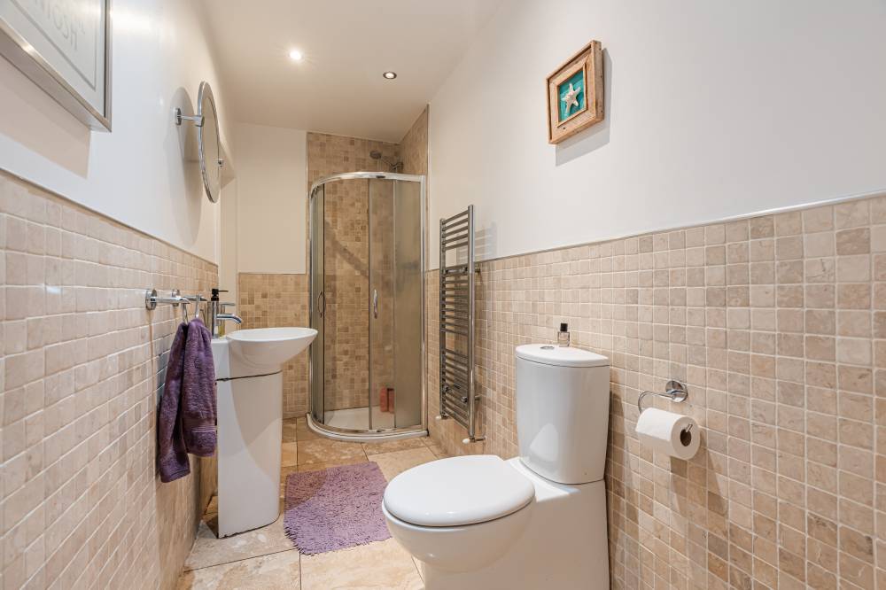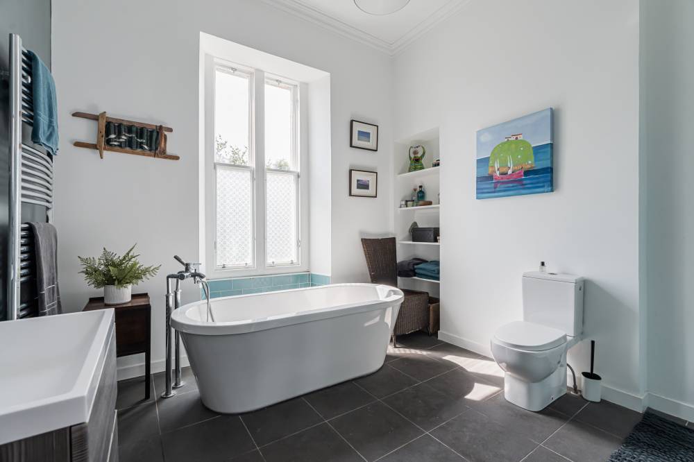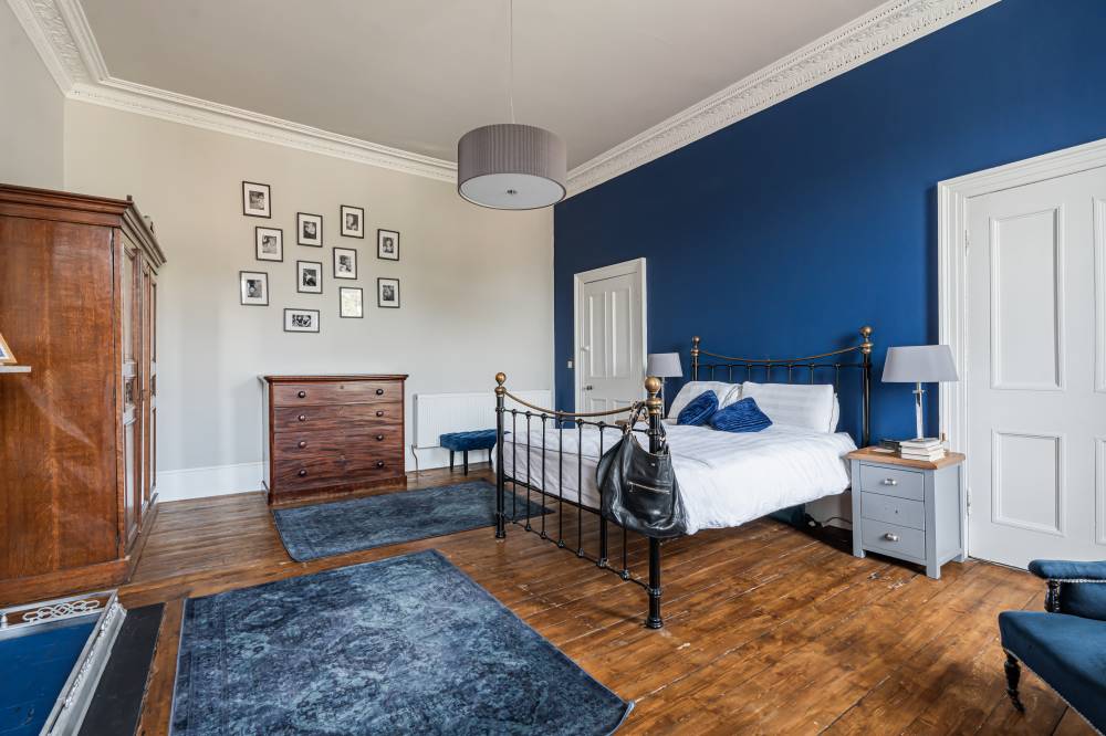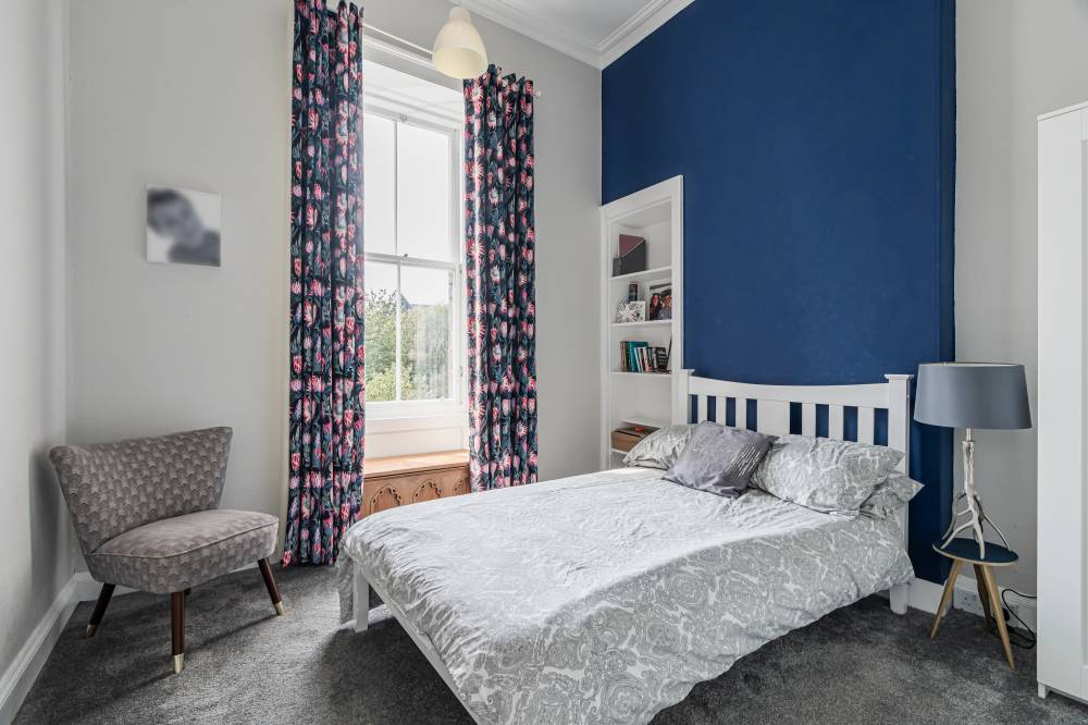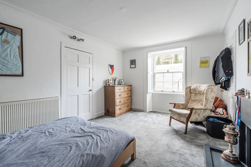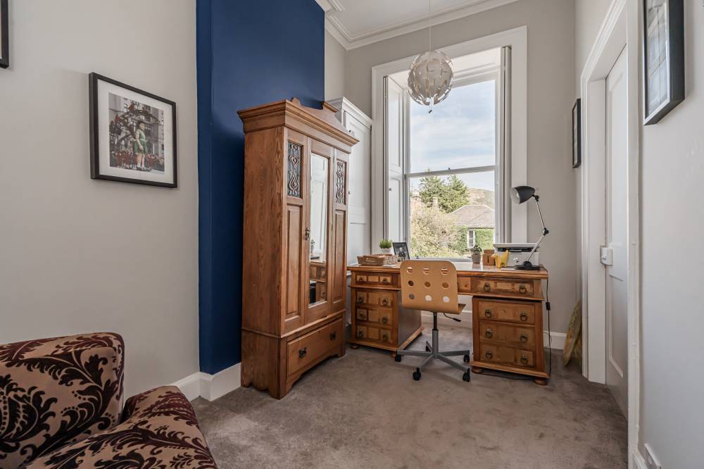 On the upper floor a central cupola floods the hallway with light, leading in turn to a generously proportioned principal bedroom with attractive wood flooring and twin windows affording a delightful open aspect towards Arthur’s Seat and over the surrounding area, two further good-sized double bedrooms, a versatile study/nursery, and convenient WC with two piece white modern suite.