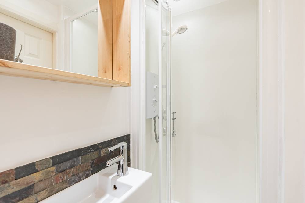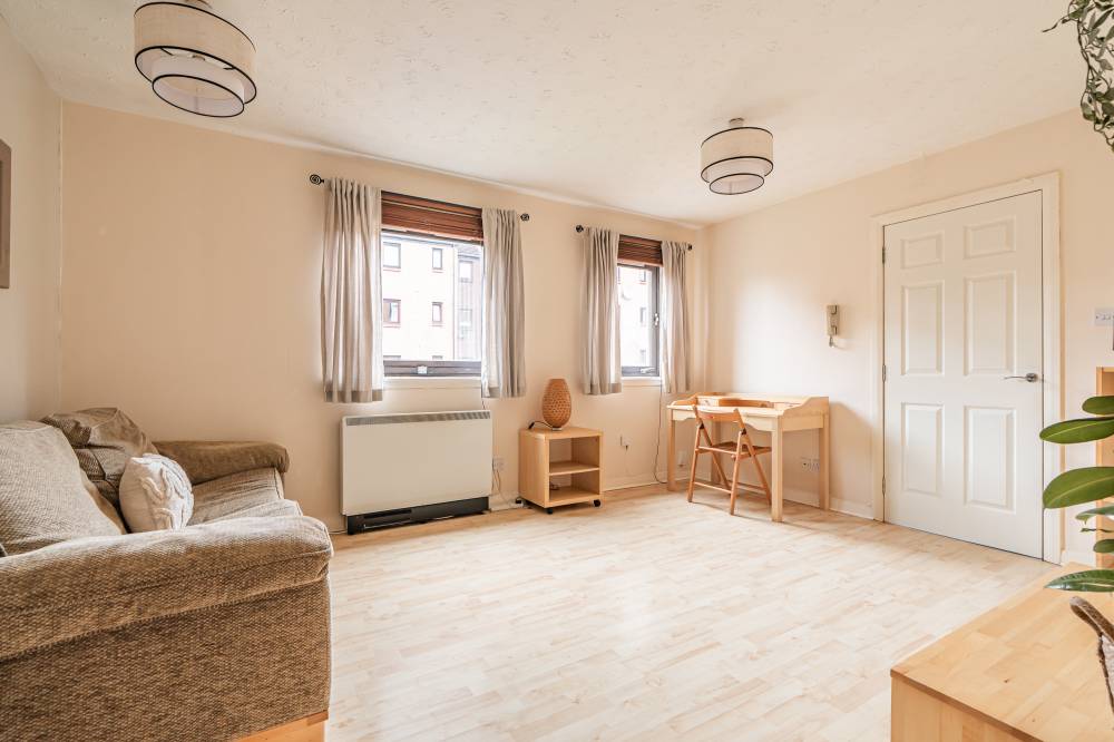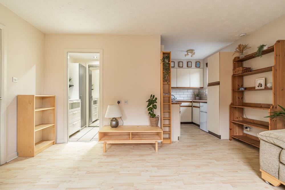 The accommodation briefly comprises: entrance hallway with storage cupboard, bright dual facing reception/dining/sleeping space with fresh neutral décor and laminate flooring, open plan to a well equipped fitted kitchen, complete with modern worktops, attractive splash tiling and a variety of appliances, walk-in wardrobe/dressing room, and compact yet well designed contemporary shower room, with two piece white suite and electric shower enclosure.