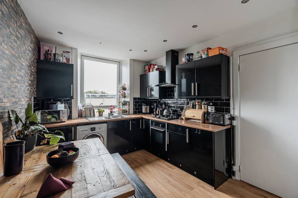Next is the dining kitchen, which combines modern style with everyday practicality. It is fitted with sleek high-gloss black units and matching monochrome tiling. A large built-in storage cupboard adds excellent utility. The room is generously sized, with plenty of space for a dining table. This makes it ideal for everyday meals or hosting friends and family.