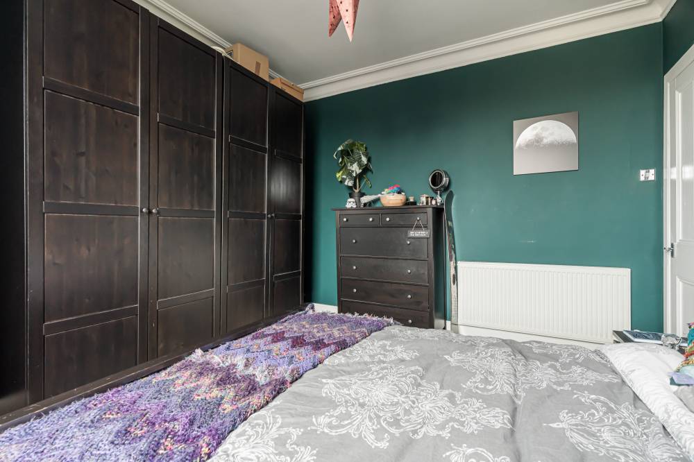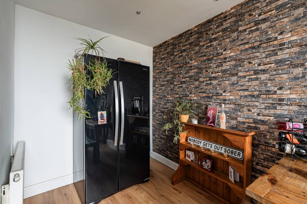 The reception room is a real highlight of this home. A striking corner window fills the space with natural light and gives a unique view. The room also has stylish laminate flooring, decorative cornicing, and a useful Edinburgh Press cupboard. Together, these features create a bright and welcoming space for relaxing or entertaining.