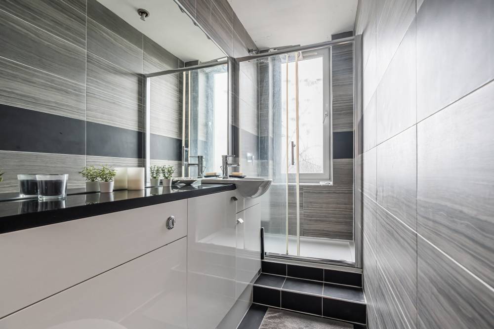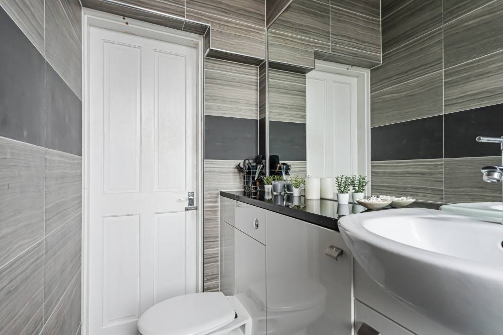 Finally, the shower room is finished to a high standard. It includes fresh tiling, a modern white two-piece suite, built-in vanity storage, a wall-mounted cabinet, and a thermostatically controlled shower for ease and comfort.