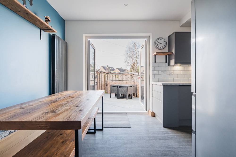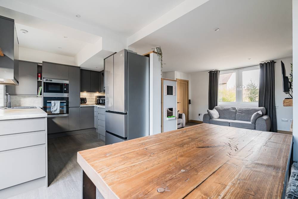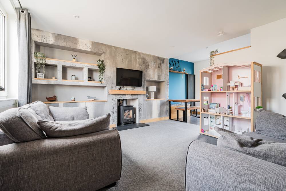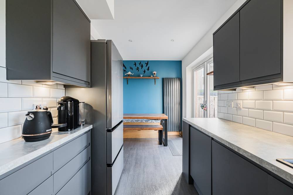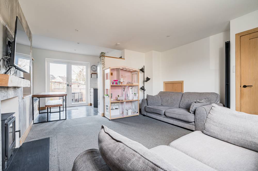 The accommodation opens with a welcoming hallway featuring a staircase to the upper level, to the front, a bright and comfortable reception room enjoys a pleasant outlook and features a real log burner, creating a warm and inviting focal point. The space flows semi–open plan into the dining kitchen, which provides direct access to the rear garden through glazed doors, perfect for both everyday family living and entertaining. The kitchen itself is modern in design, fitted with a range of high-quality wall and base units, matching integrated appliances, and sleek subway-tiled splash areas. Upstairs, there are two generous double bedrooms, both decorated in contemporary neutral tones with fitted carpeting, along with a spacious single bedroom offering excellent storage options. The family bathroom has been tastefully upgraded and features a stylish white suite, including a wash hand basin set within vanity storage, and a walk-in shower cubicle with a dual-headed thermostatic shower. Elegant black fixtures and fittings, complemented by a heated towel rail, complete the look.