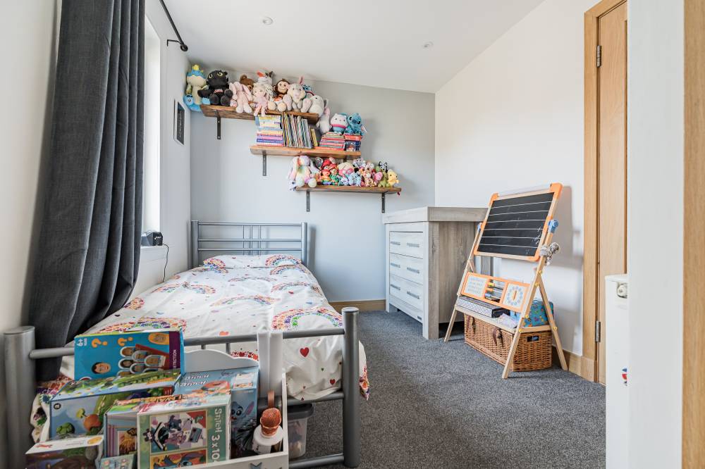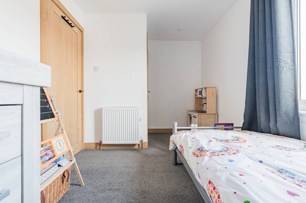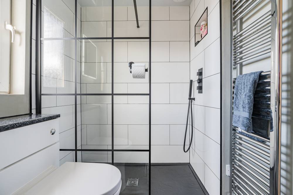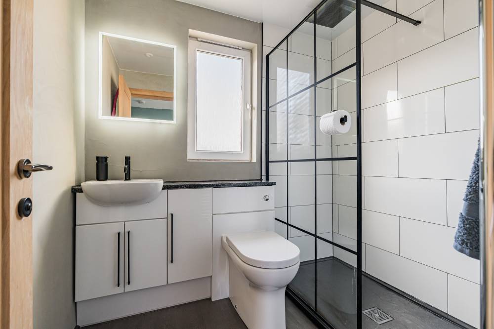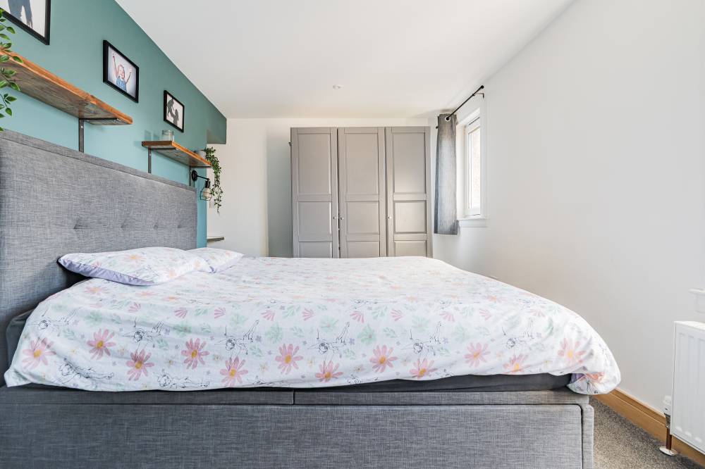 The accommodation opens with a welcoming hallway featuring a staircase to the upper level, to the front, a bright and comfortable reception room enjoys a pleasant outlook and features a real log burner, creating a warm and inviting focal point. The space flows semi–open plan into the dining kitchen, which provides direct access to the rear garden through glazed doors, perfect for both everyday family living and entertaining. The kitchen itself is modern in design, fitted with a range of high-quality wall and base units, matching integrated appliances, and sleek subway-tiled splash areas. Upstairs, there are two generous double bedrooms, both decorated in contemporary neutral tones with fitted carpeting, along with a spacious single bedroom offering excellent storage options. The family bathroom has been tastefully upgraded and features a stylish white suite, including a wash hand basin set within vanity storage, and a walk-in shower cubicle with a dual-headed thermostatic shower. Elegant black fixtures and fittings, complemented by a heated towel rail, complete the look.