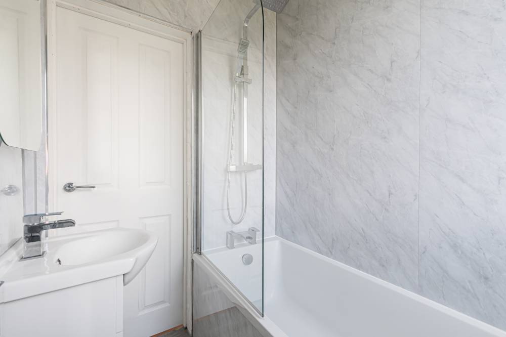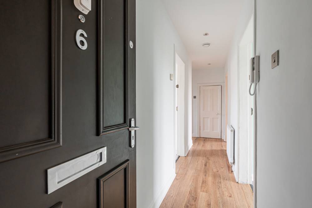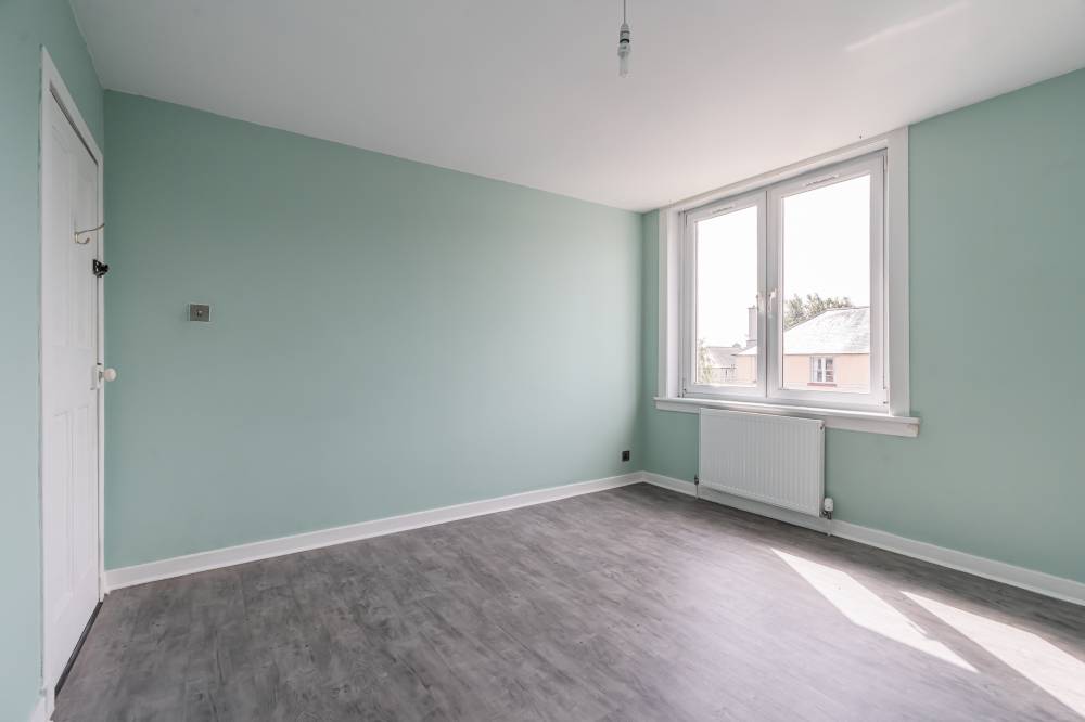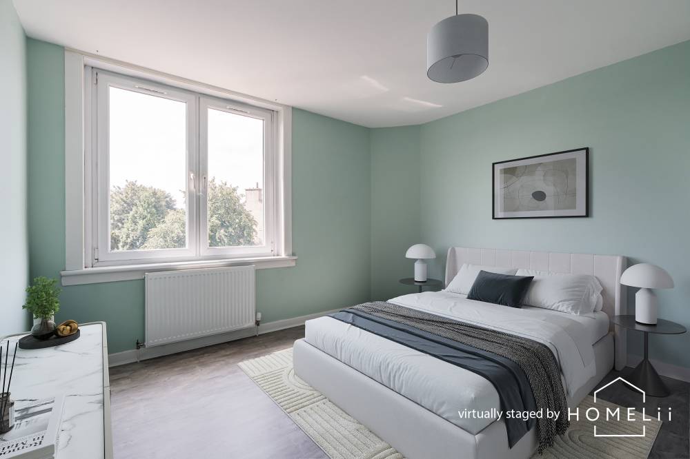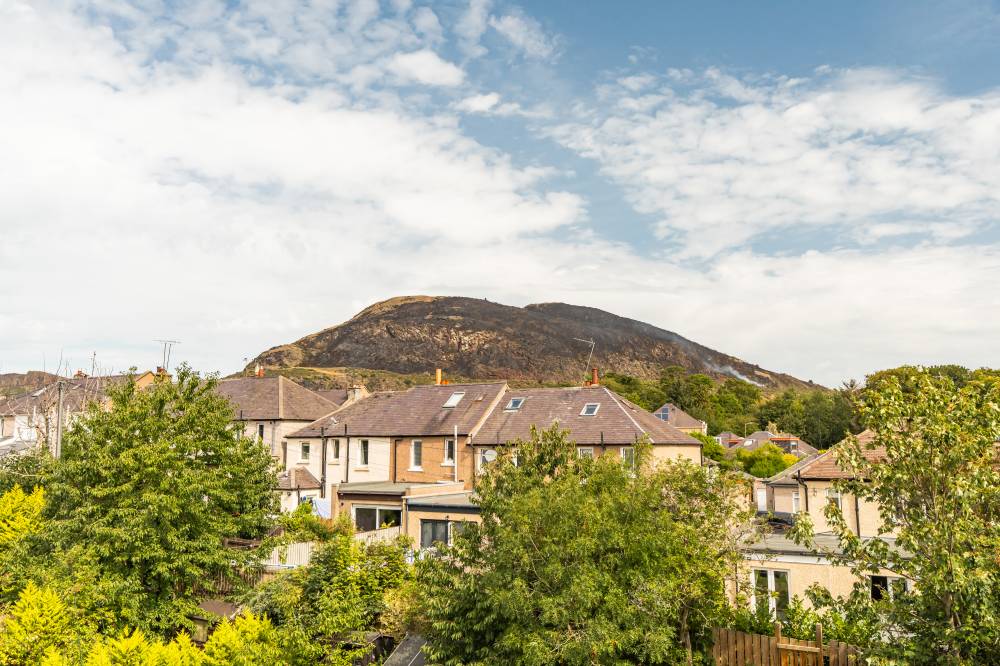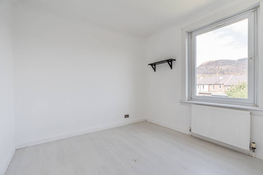 A welcoming hallway introduces the bright and well-presented interior, complete with a useful cloak cupboard and an additional sizeable storage cupboard. The spacious lounge diner enjoys a front-facing position with twin windows that flood the room with natural light, and a practical built-in storage cupboard adds to its everyday functionality. The modern kitchen is fitted with a range of integrated and freestanding white goods, complemented by sleek partial tiling in splash areas, mood-setting under-unit lighting, and an overhead cupboard for extra storage. From here, the rear aspect offers the same delightful outlook as the second bedroom. The principal bedroom is a generous double with a front aspect and ample room for freestanding furniture, while the second bedroom is also a well-proportioned double, enjoying serene rear views towards Arthur’s Seat. The bathroom is fully paneled for easy maintenance and features a rainfall shower over the bath, a heated towel rail, and a stylish, contemporary finish.