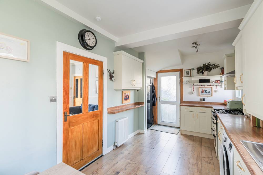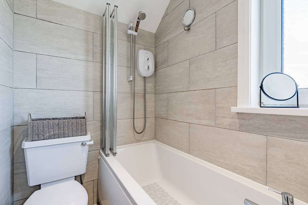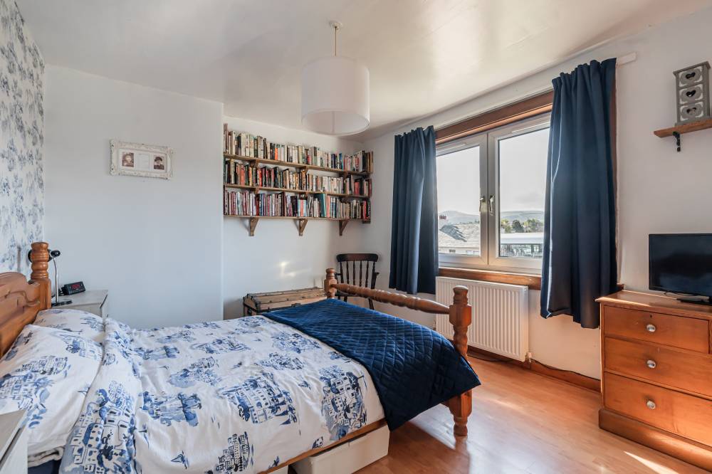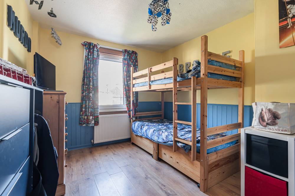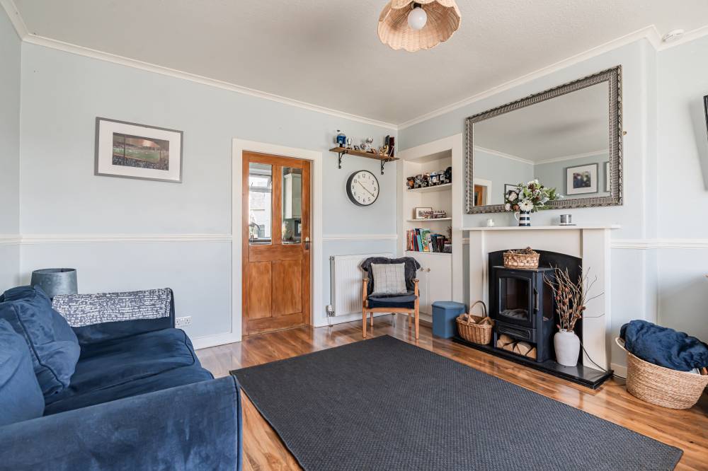 The accommodation begins with a welcoming hallway leading to a bright front-facing reception room. This comfortable living space features a fireplace, useful shelved storage, and ample room for both relaxation and entertaining. To the rear, a generous dining kitchen is fitted with an excellent range of wall and base units and offers plenty of space for dining. Direct access to the rear garden enhances the appeal for those who enjoy indoor-outdoor living or al-fresco dining during the warmer months. Upstairs, the principal double bedroom is positioned to the front and enjoys open views towards the Pentland Hills. It benefits from mirror-fronted built-in wardrobes and additional storage. A second well-proportioned double bedroom is set to the rear, finished with modern laminate flooring. The bathroom is stylishly appointed with contemporary tiling, a white three-piece suite, and a Mira electric shower over the bath.