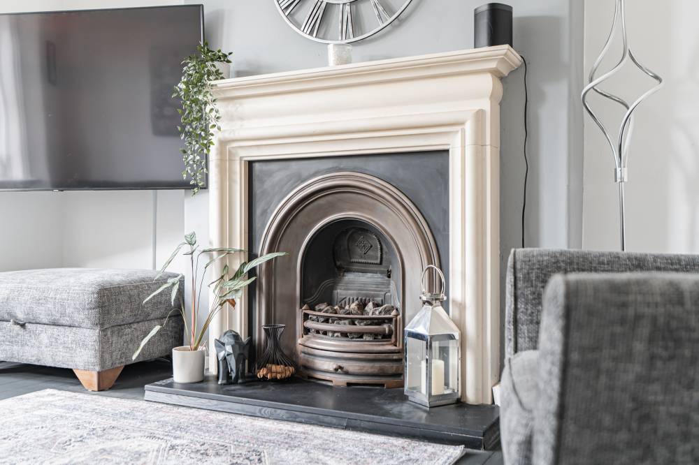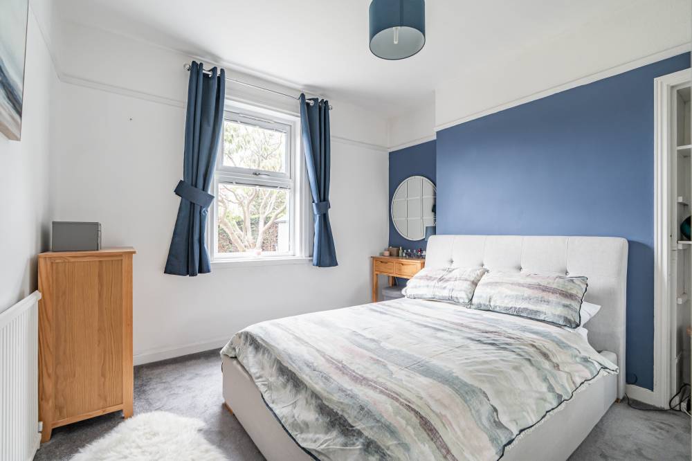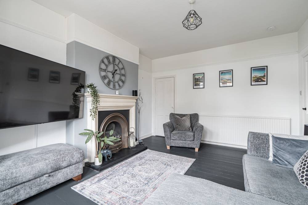 The main reception room is a delightful space, enhanced by a charming bay window that allows natural light to flood in, and a feature fireplace that adds warmth and character. The kitchen is a standout feature of the property, designed in a contemporary style with integrated appliances, plentiful storage, and generous space for dining. A rear door leads directly out to the garden, blending indoor and outdoor living. There are two spacious bedrooms: the front-facing double benefits from plush carpeting and excellent built-in storage, while the rear bedroom enjoys modern décor and ample proportions. The fully tiled bathroom completes the accommodation, fitted with a sleek white three-piece suite and mains shower.