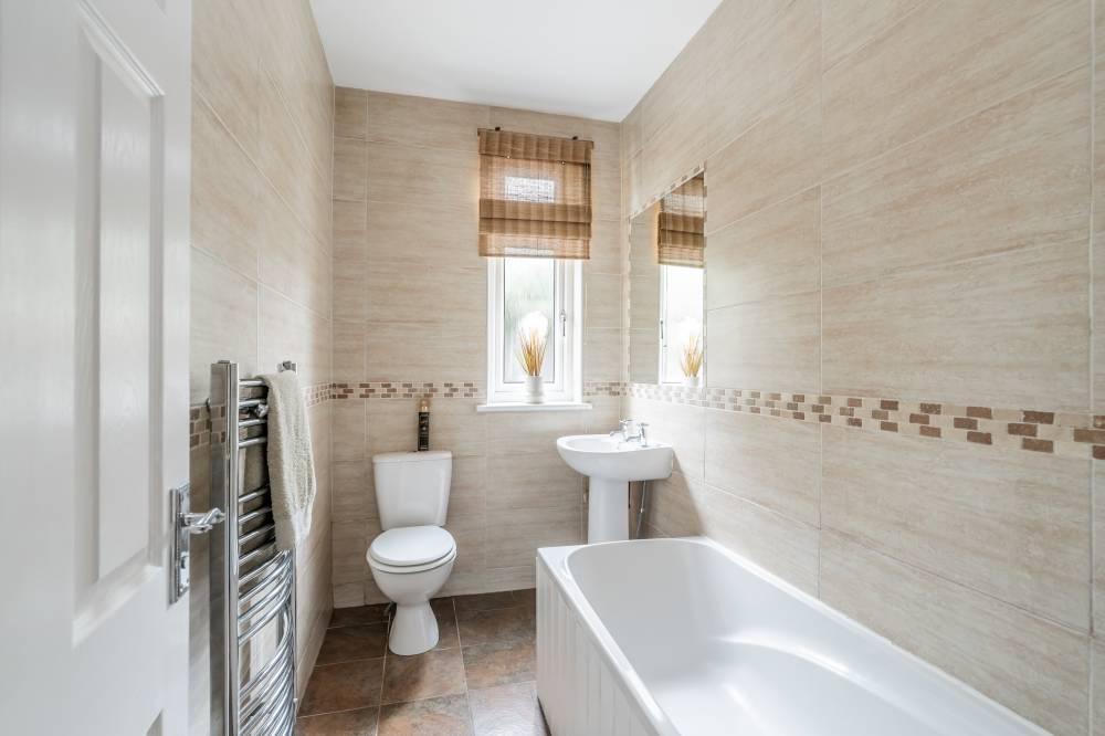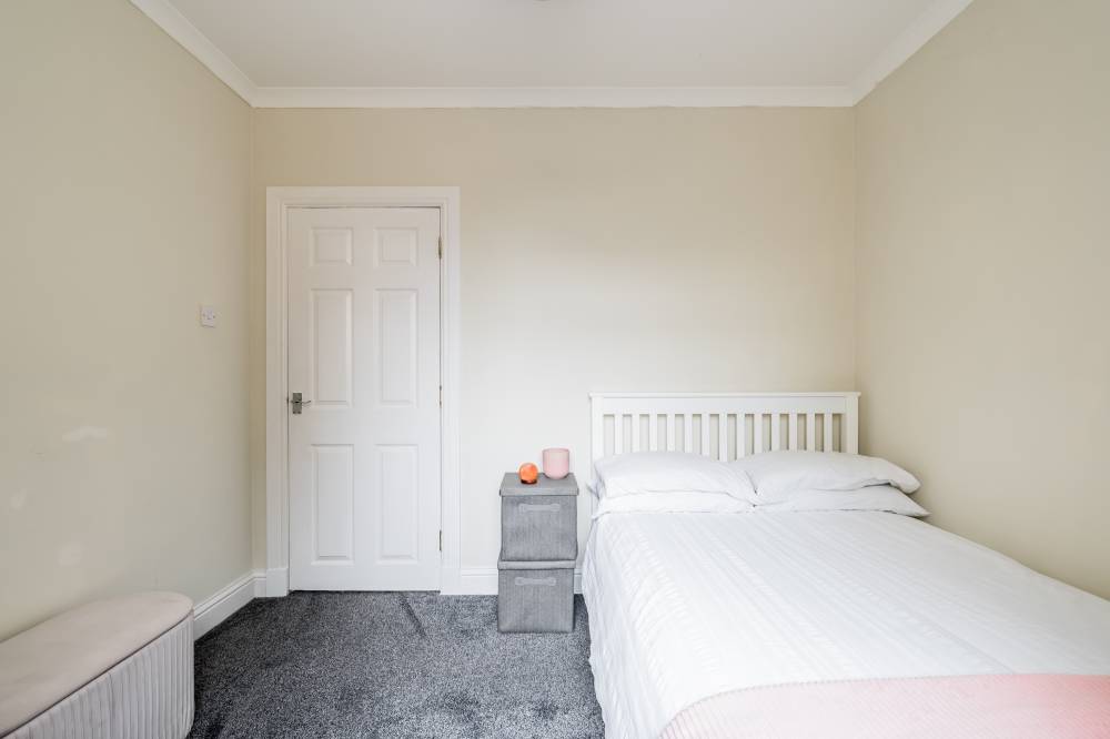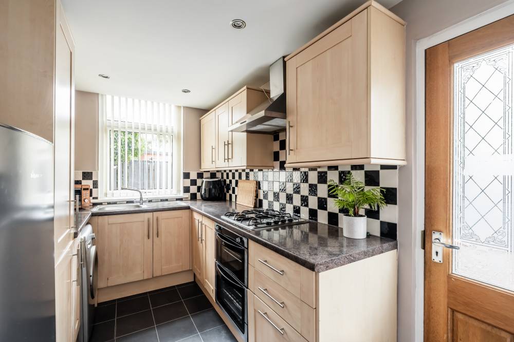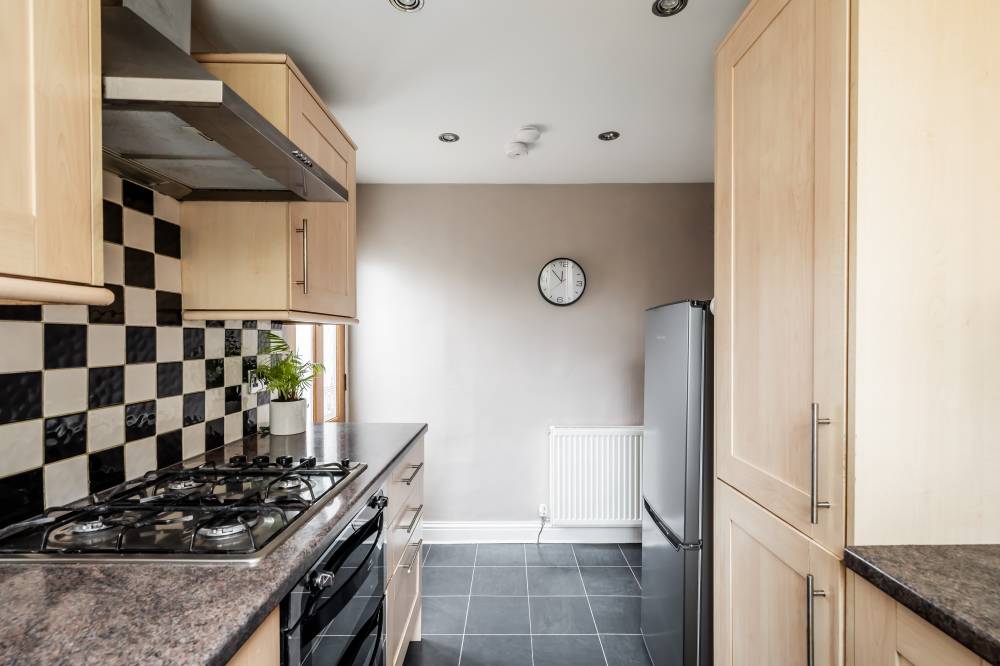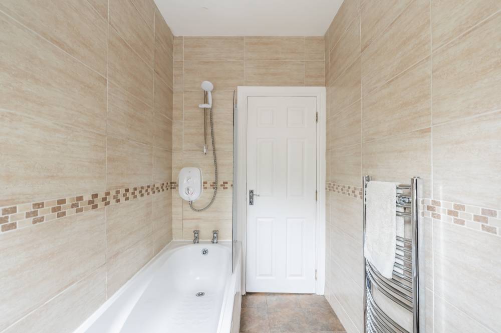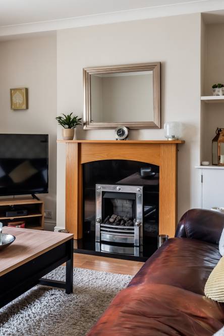 The accommodation begins with a welcoming vestibule leading into the hallway, which offers a useful walk-in storage cupboard. The front-facing reception room is bright and spacious, featuring laminate flooring and a focal fireplace. To the rear, the fitted kitchen provides direct access to the garden and is equipped with wooden wall and base units, tiled splash areas, and integrated appliances including a gas hob, oven, and fridge freezer. There are three well-proportioned double bedrooms. The principal bedroom enjoys a sunny southern outlook to the front, while the two rear-facing doubles both benefit from neutral décor, one with built-in shelved storage. The bathroom is fully tiled and fitted with a modern three-piece white suite, electric shower over the bath, and a glass screen.