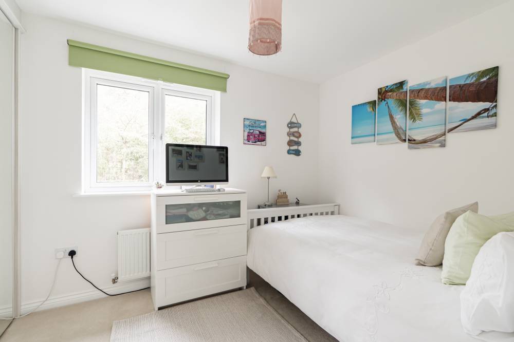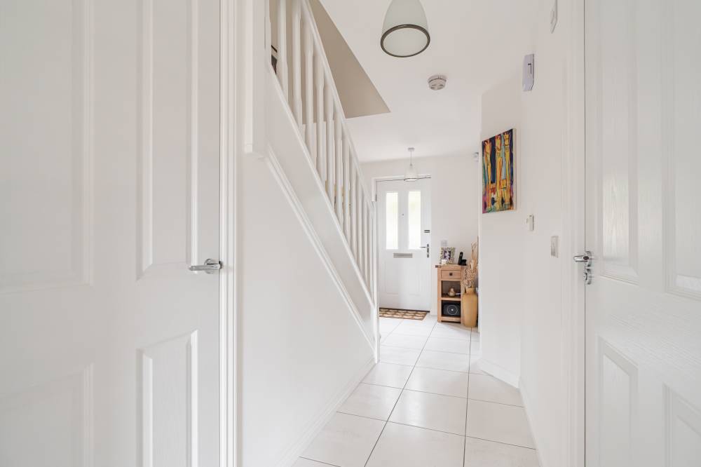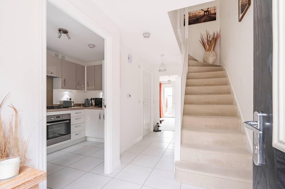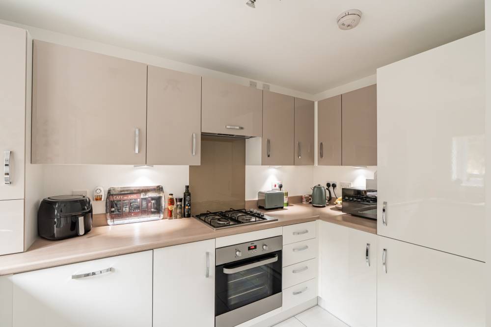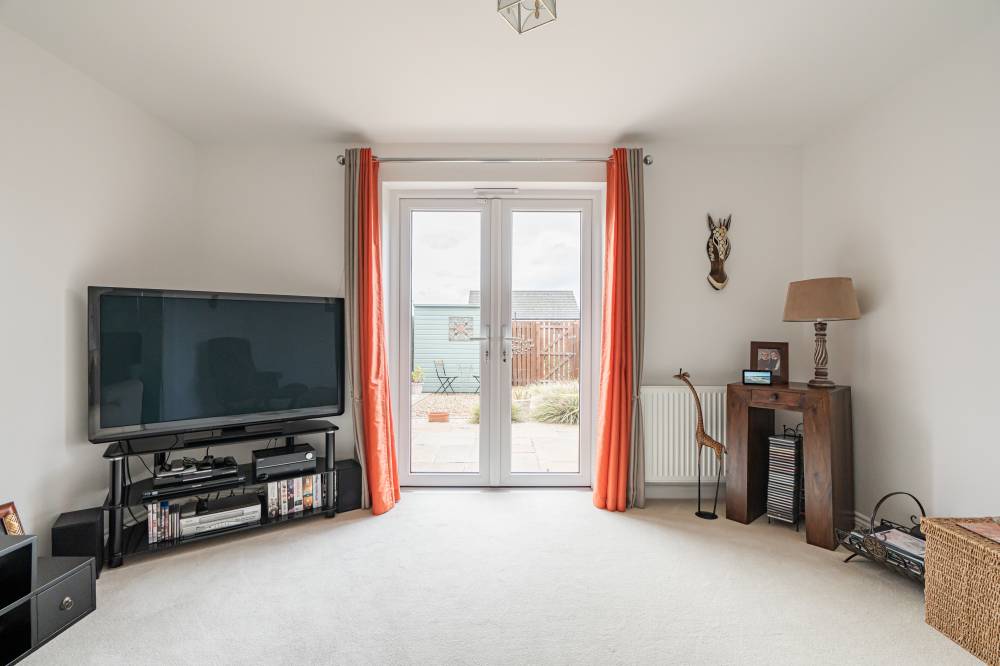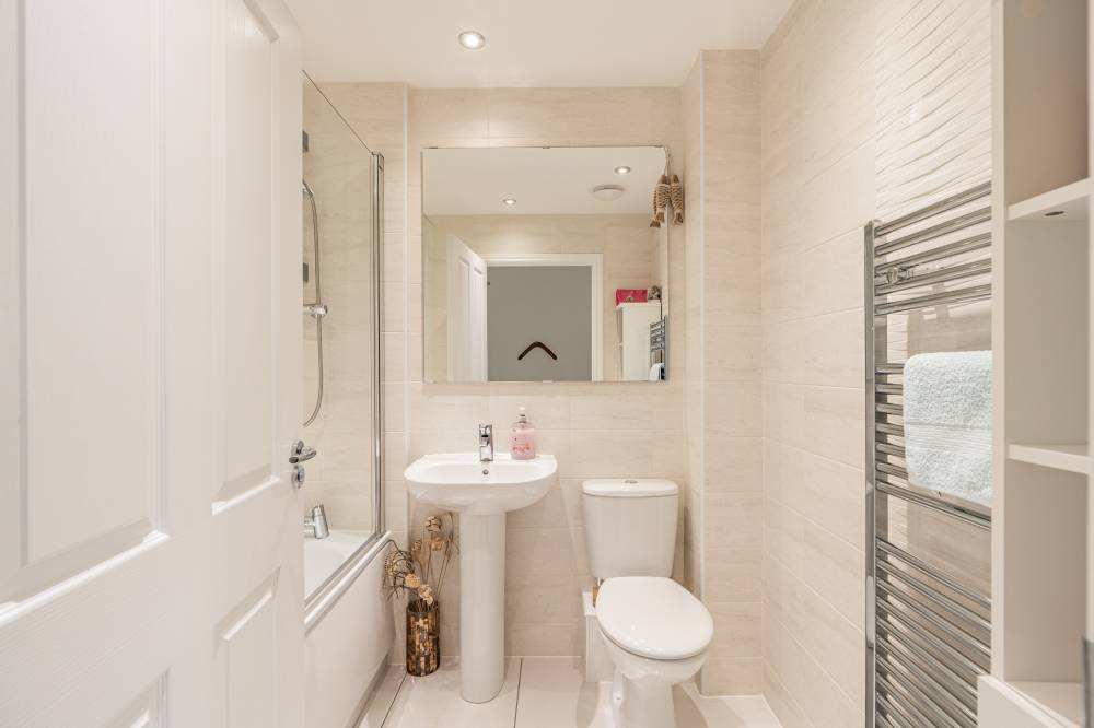 Internally, the accommodation is finished to a high standard and briefly comprises: welcoming entrance hallway with tiled flooring and handy understairs storage cupboard, bright and spacious lounge/diner with French doors opening onto the garden, and a modern fitted kitchen with a range of integrated appliances, tiled flooring, and mood-setting under-unit lighting. Completing the ground floor is a stylish two-piece WC with partial tiling and tiled flooring. Upstairs, the landing offers access to the attic. There are two generously proportioned double bedrooms – the principal set to the rear with wall-to-wall fitted wardrobes and ample space for freestanding furniture, and a second double with integrated wardrobes and a pleasant leafy outlook to the front. The accommodation is completed by a smart, fully tiled bathroom with a shower over bath, heated towel rail, and tiled flooring.