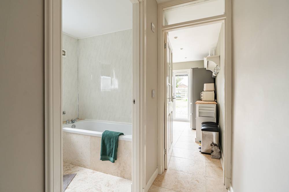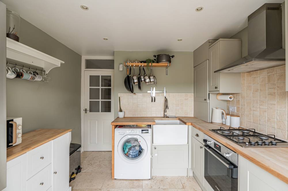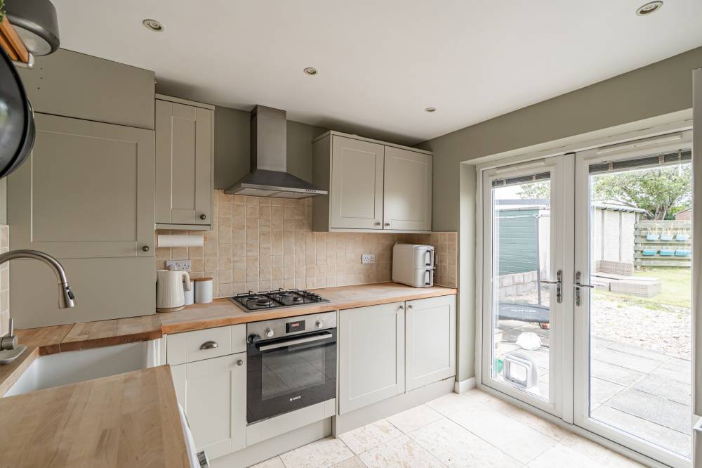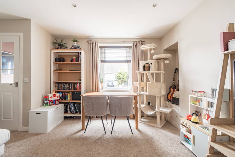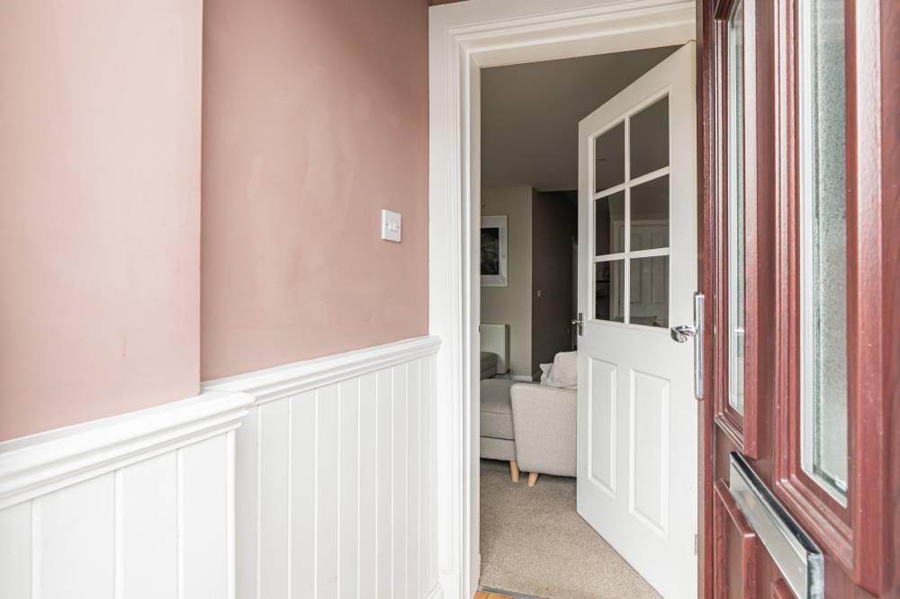 The property is approached via a welcoming vestibule, leading into a bright and generously sized reception room. With a front-facing aspect, fitted carpet, and ample space for both seating and dining, this room forms a comfortable hub for everyday living and entertaining. To the rear, a well-appointed kitchen is fitted with a range of wall and base units, an integrated oven, hob and dishwasher alongside a charming ceramic Belfast sink. Double-glazed doors open directly onto the rear garden, creating a natural flow between indoor and outdoor spaces. The ground floor also hosts a well-proportioned double bedroom, enjoying a tranquil rear aspect, as well as the main bathroom. The bathroom is fitted with a modern three-piece suite and finished with full wet-wall acrylic panels for a contemporary, low-maintenance design. Upstairs, the principal bedroom is a particularly appealing feature of the home, offering generous proportions, an en-suite shower room, and stunning far-reaching views across open fields to the rear.